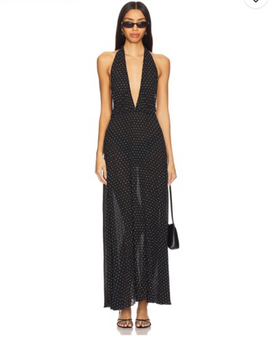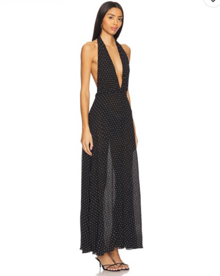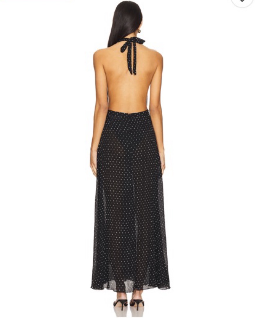 Unlined Halterneck tie Hidden back zipper Garment is made with a semi-sheer fabric, undergarments can show through