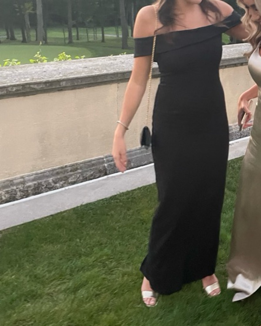 Revolve dress worn once for a wedding!! Super comfy and flattering for a black tie wedding. Im 5’ 6 and the length was perfect with a heel. Please no hemming.