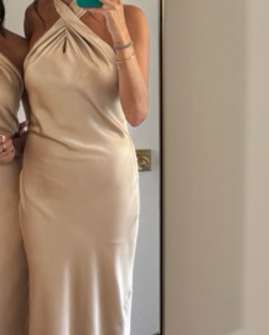 Bridesmaid dress. Champagne color. Slight taken in on sides and hemmed for 5’7 height.