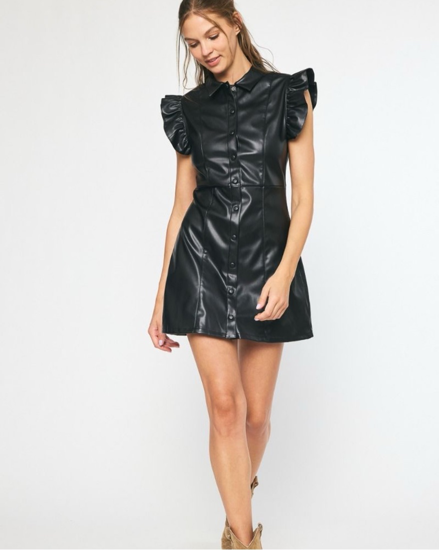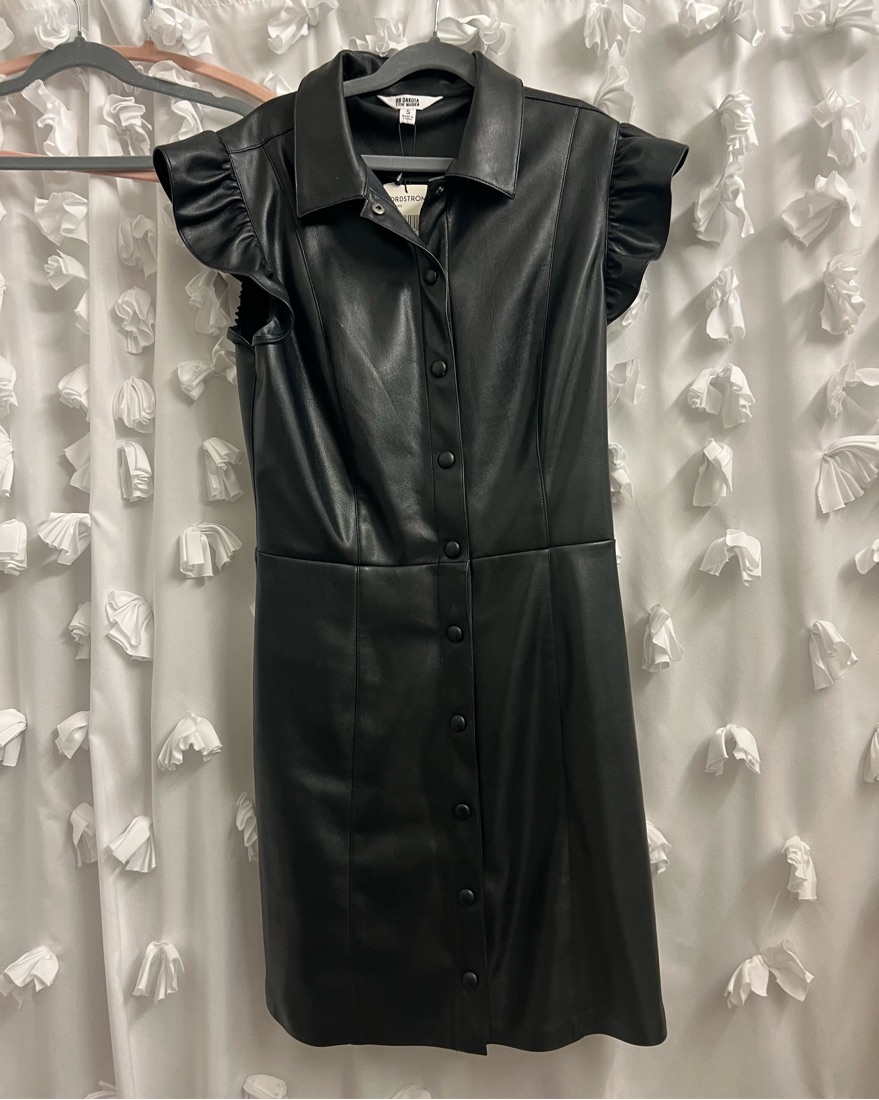SOLD OUT BB Dakota x Steve Madden Lima Faux Leather Black Mini Shirtdress Size S Ruffles make an unexpected delight shaping the cap sleeves on this faux-leather shirtdress that melds office appropriate with street chic.