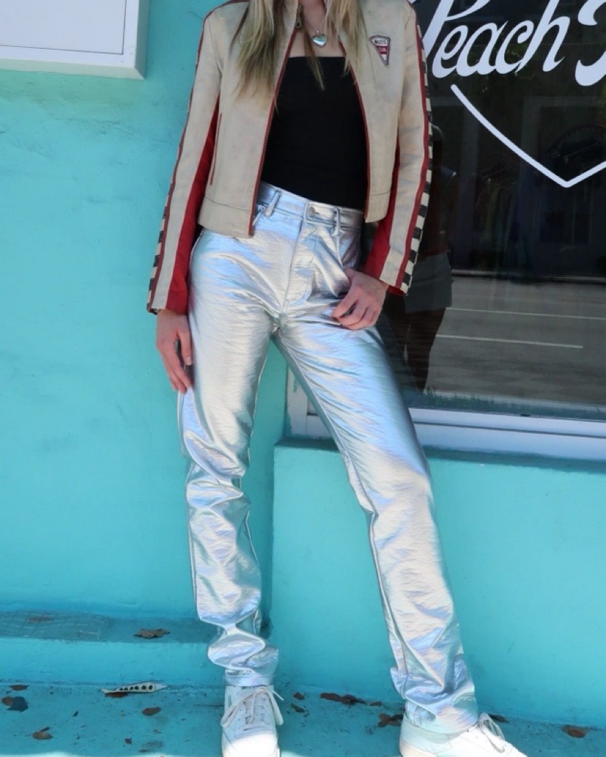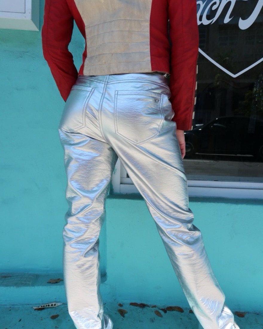 Brand: Diesel Straight Leg Condition: Good Color: Silver Material: Outer: 100% Polyurethane, Inner: 100% Rayon-Viscose Measurements: Waist: 30 inches Hips: 38 inches Length: 44 inches Inseam: 31.5 inches
