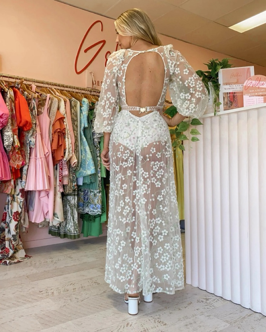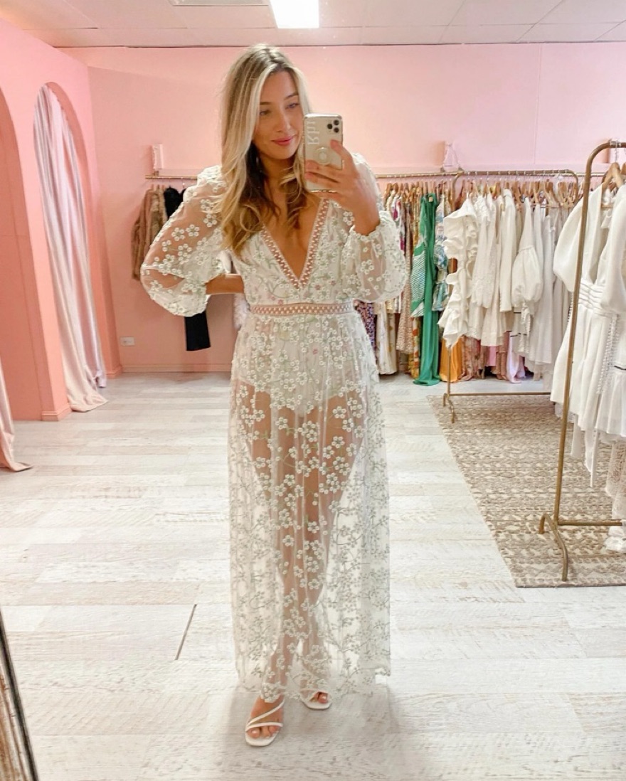 For Love + Lemons Eclair Maxi Dress never worn! Fitted elastic-feeling bodice and sheer white, green and a little pink floral pattern. Super fun for a festival or a bride!