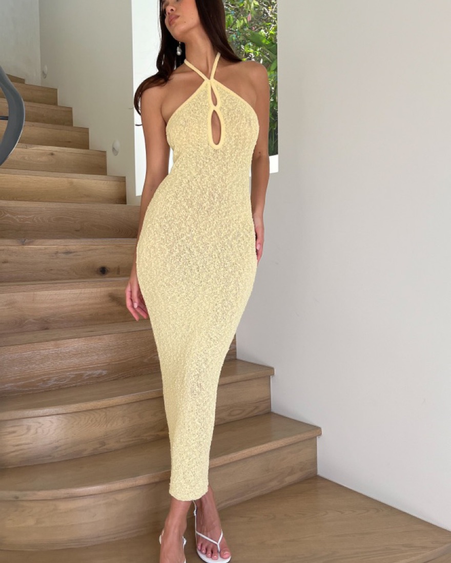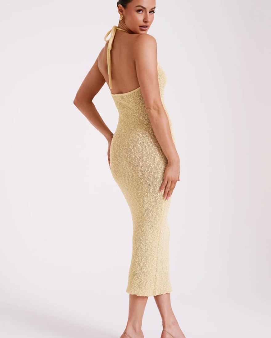 Halter neckline• Textured boucle knit • Semi Sheer• No closure • Slip on design • Unlined• Midi length • New With Tags!