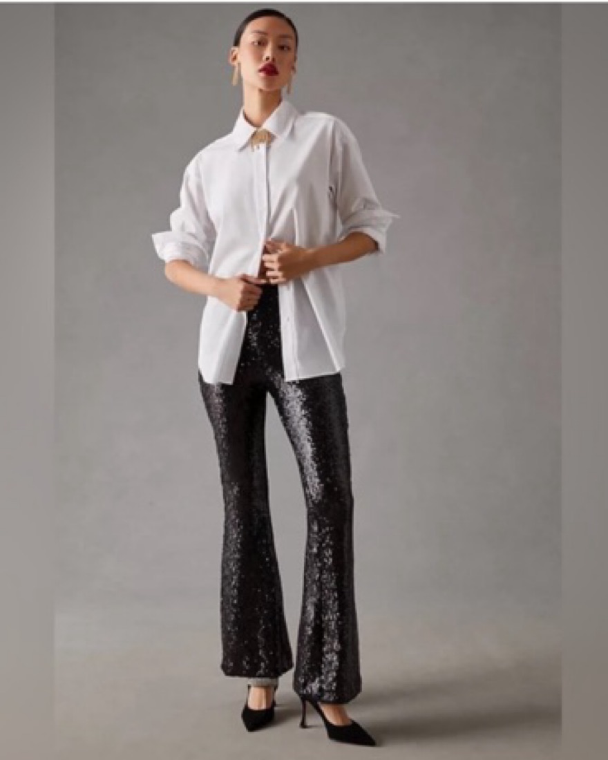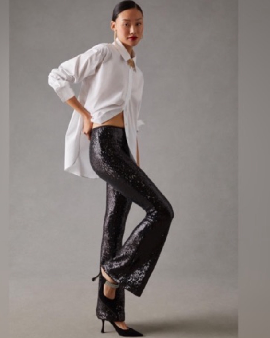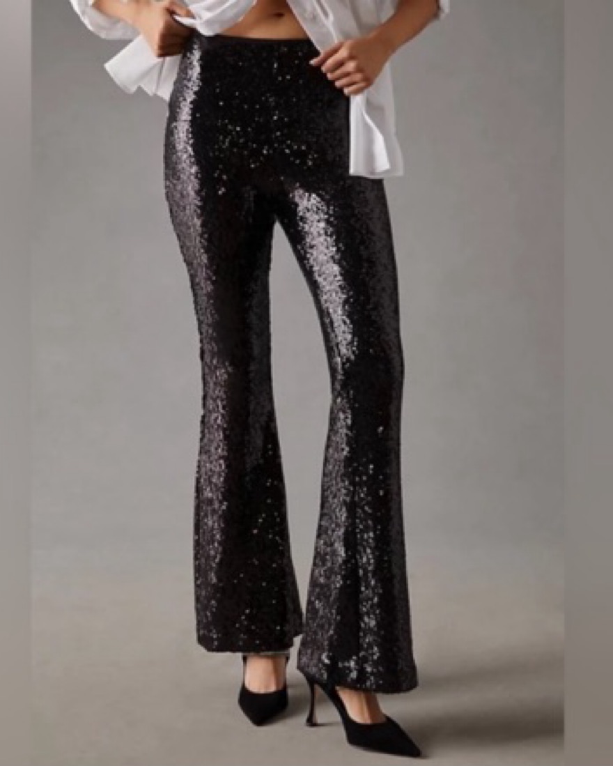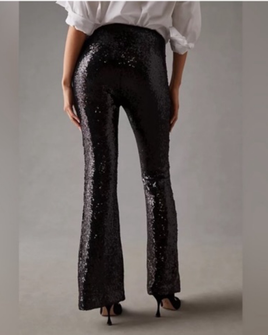 Super comfy and flattering, wear these fun black sequin pants to your next party or festive event! Fitted in the waist and through the thigh, flaring out towards the bottom of the leg. Smooth waistband and invisible side zipper. In excellent condition.