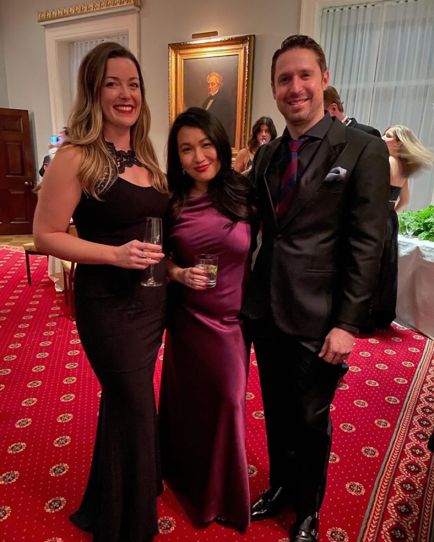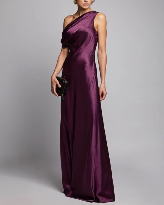 Black tie ready one shoulder gown, slim-fitting, floor length, satin.