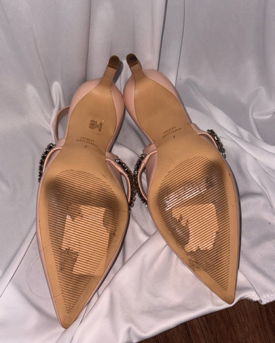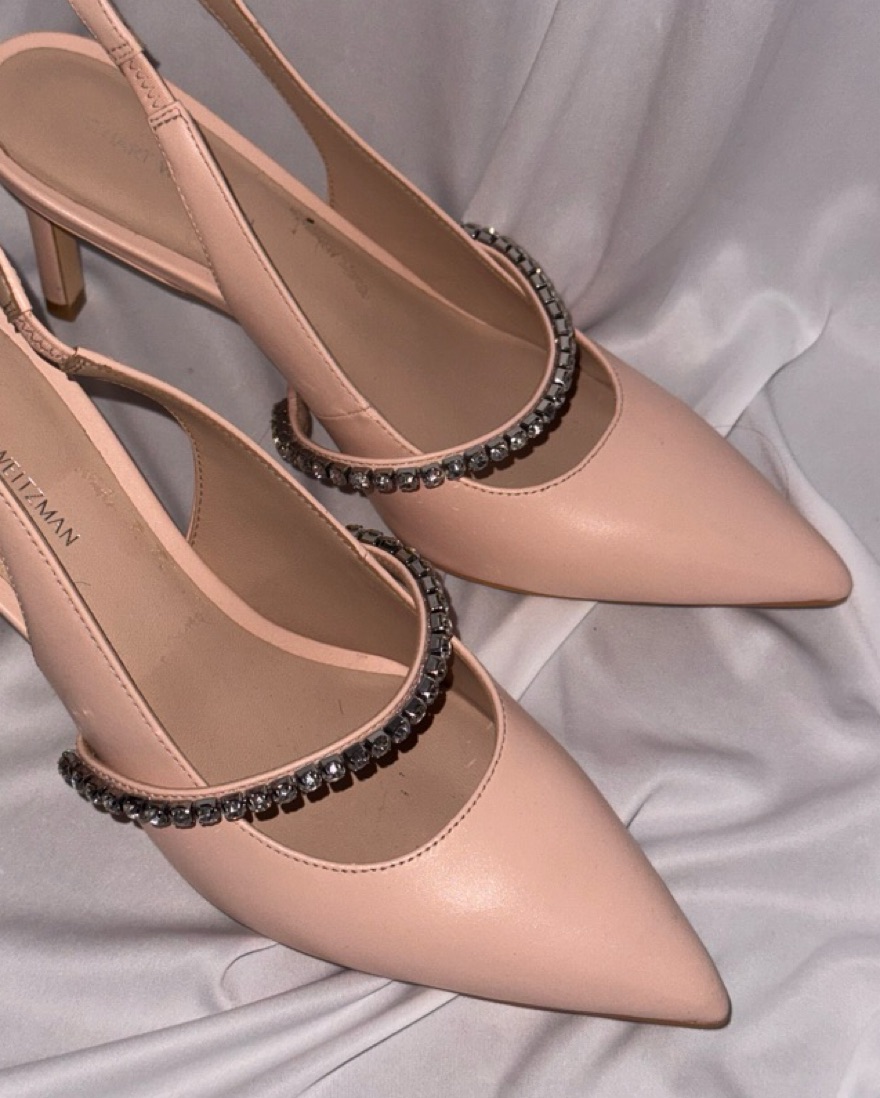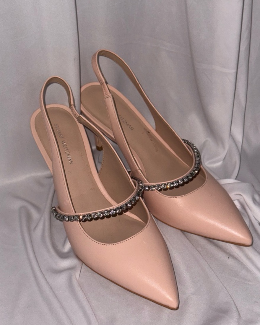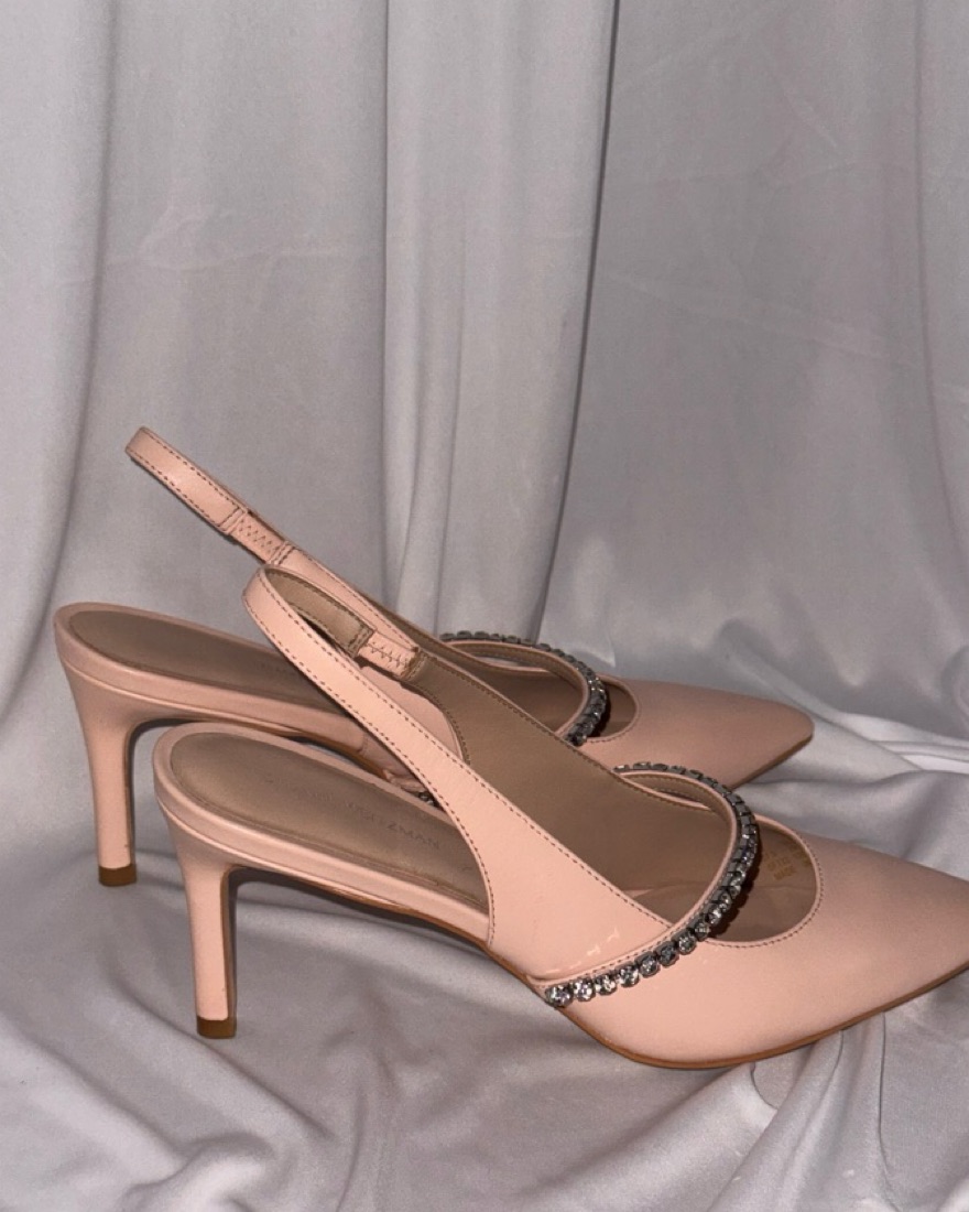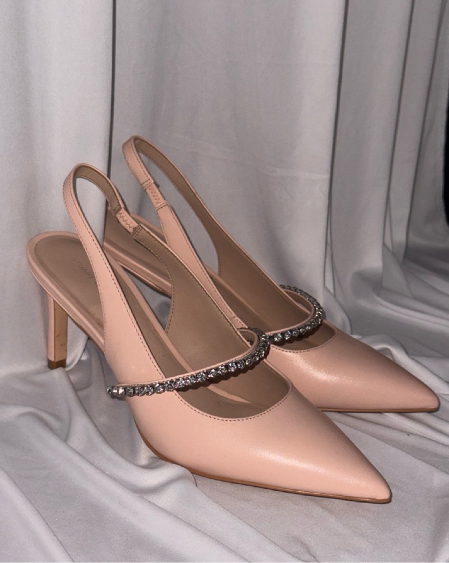 These stylish satin slingback heels are the perfect addition to your evening attire. The crystal embellishments add a touch of glamour, making them an ideal choice for a special occasion. Runs half a size small. US 7