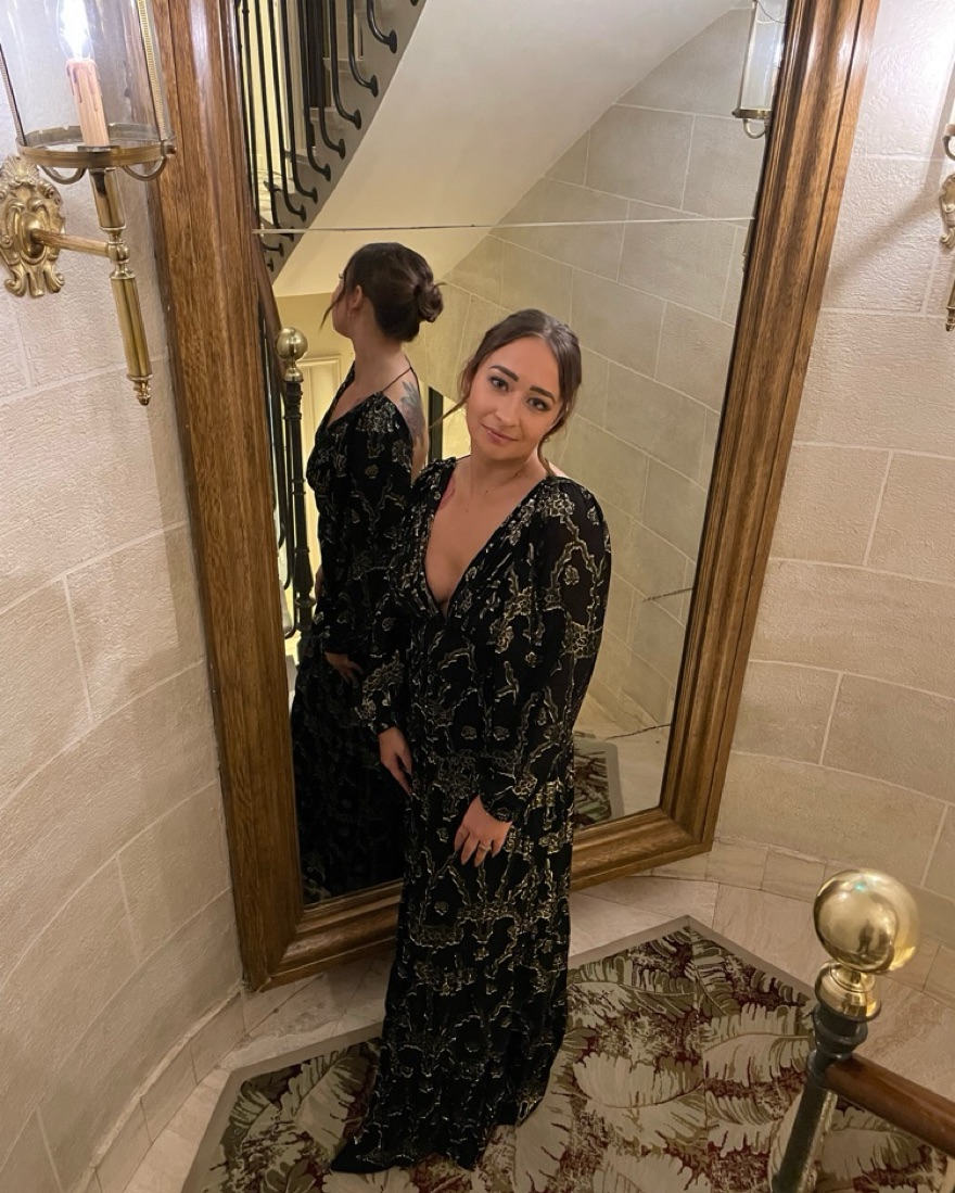 Black with good detailing, open back, worn twice. Second time i rolled long sleeves under to make flowy short sleeves. Bought in EU so sizing is different - actual size 0 but I typically am a 4. Can provide measurements upon request.