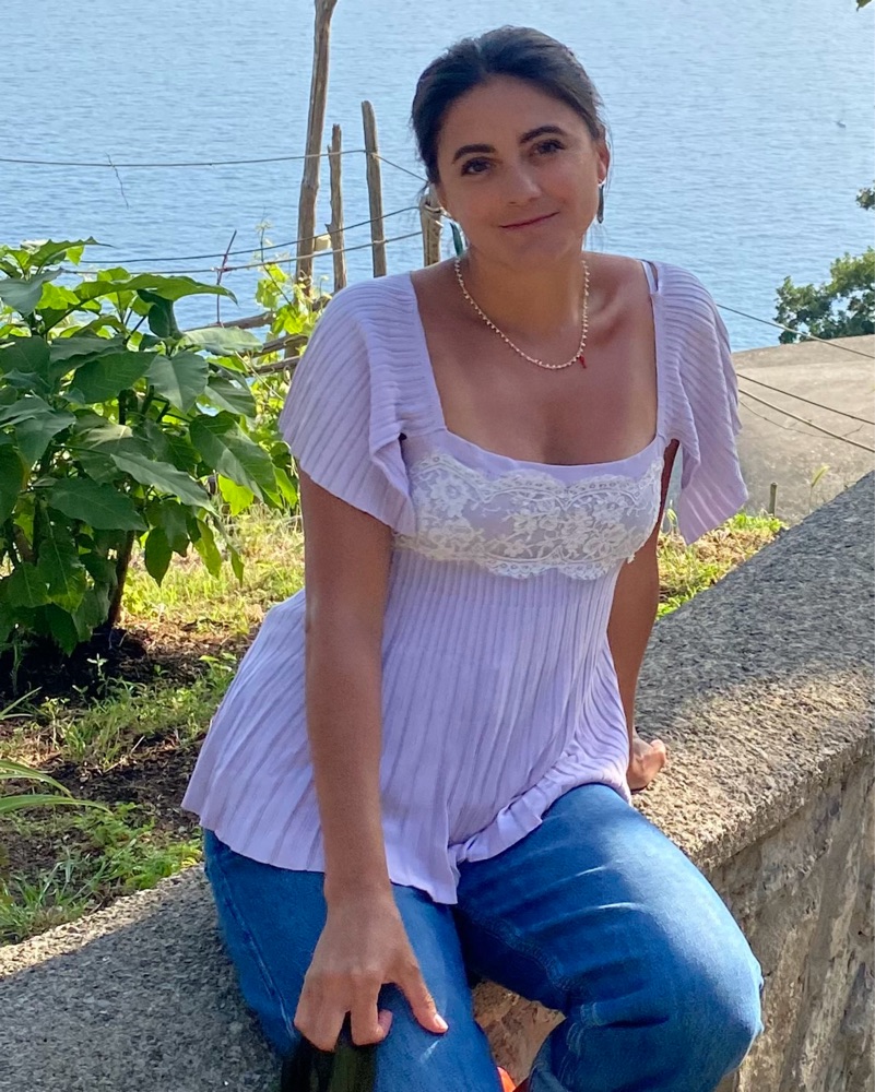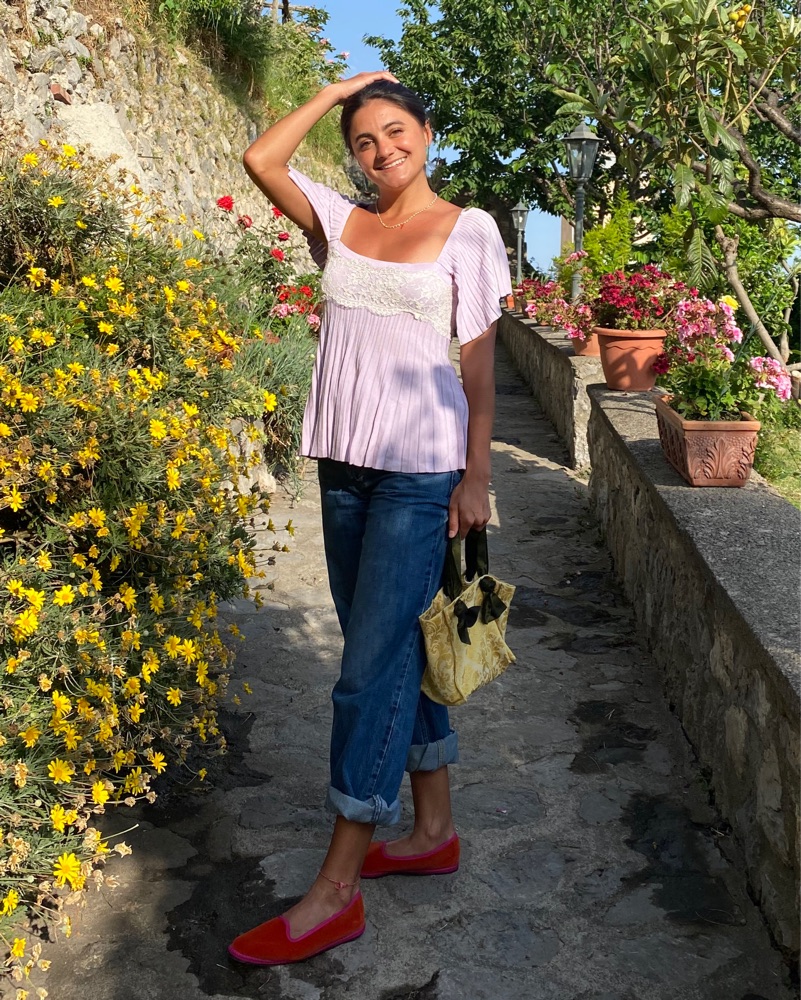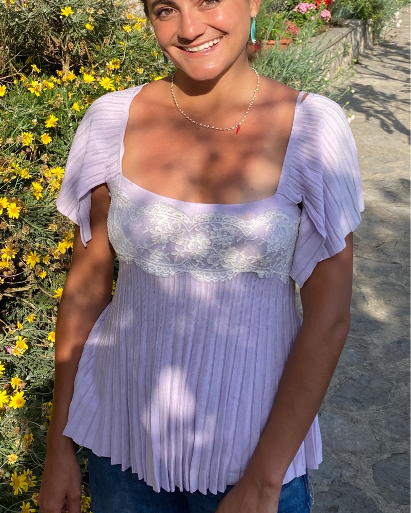 This delicate, pleated blouse in a soft lavender hue and lace is perfect for a garden party or casual daytime event. The lace detailing adds a touch of femininity to the flowy silhouette.