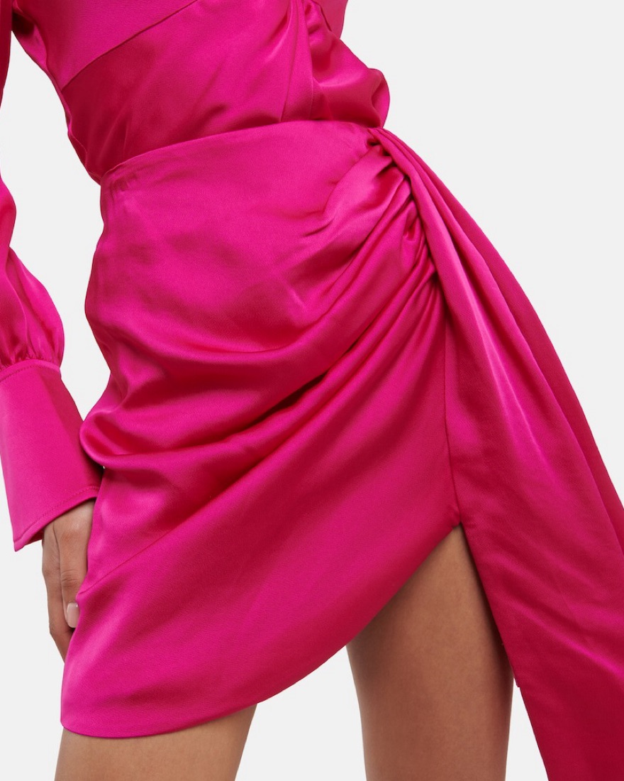 This captivating fuchsia satin skirt is perfect for a glamorous night out. The ruched design and billowy sleeves create a truly show-stopping look. The color is called Bougainvillea