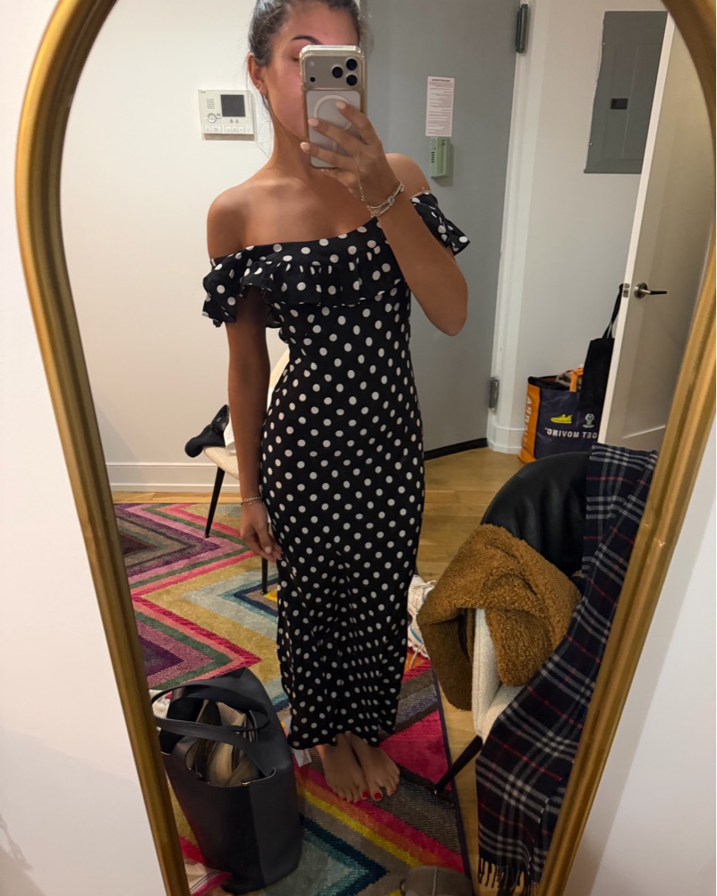 Black and white polka dot dress - can be work on or off the shoulder. Ties in the back. Perfect to dress up or down!