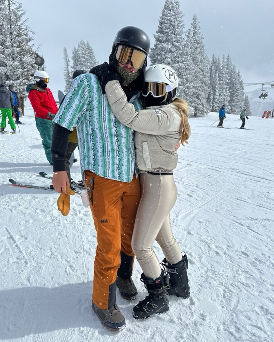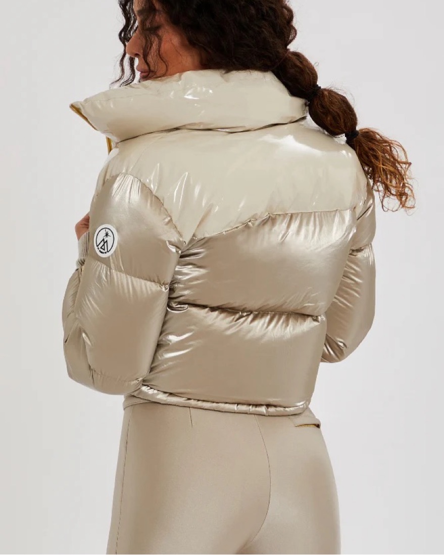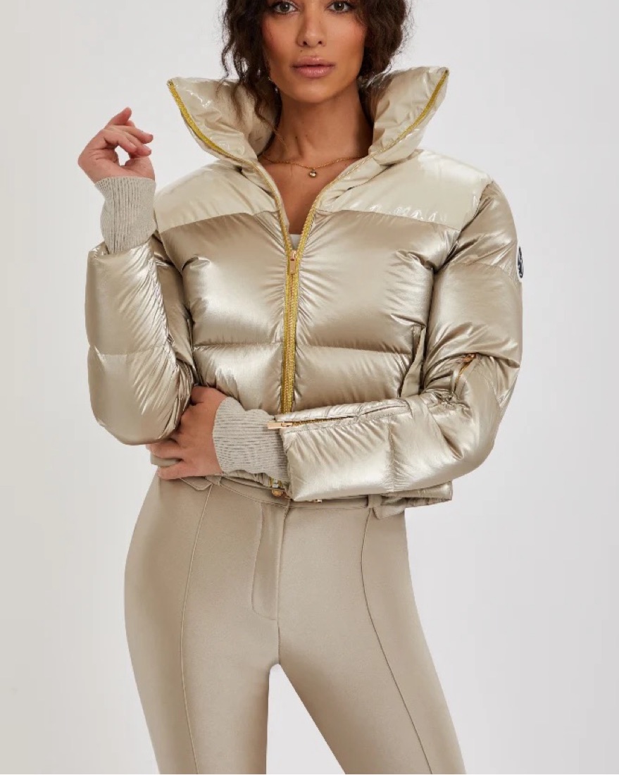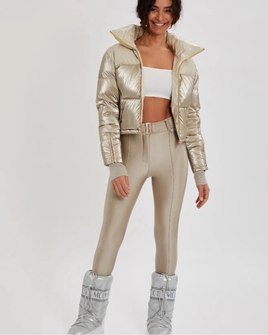 My Sunday Ski Cropped Bomber Ski Jacket and Slalom Ski Pants in champagne shimmer - both medium. This sleek and shiny set is perfect for staying warm and stylish on the slopes. So cute!!