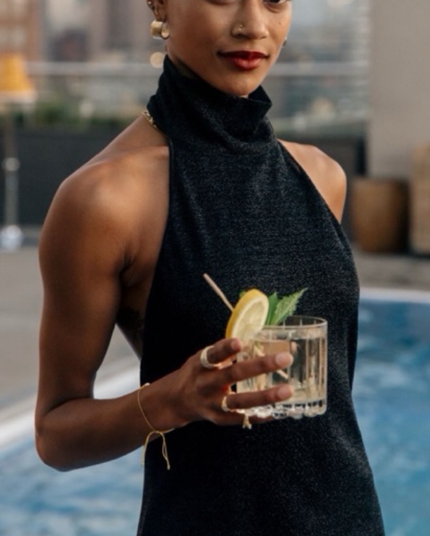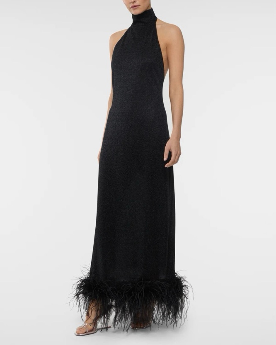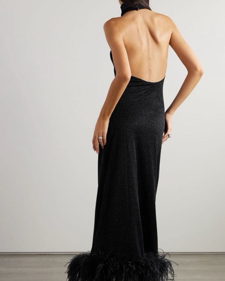 Fitted w/open back, voluminous skirt, & feather fringe. Kinda gives sexy feather duster. Dress is stretchy, likely fit S or M but the cut can be challenging with a larger chest. Works as a floor length gown for petites. Material is thin not see through but I recommend checking in all lighting..