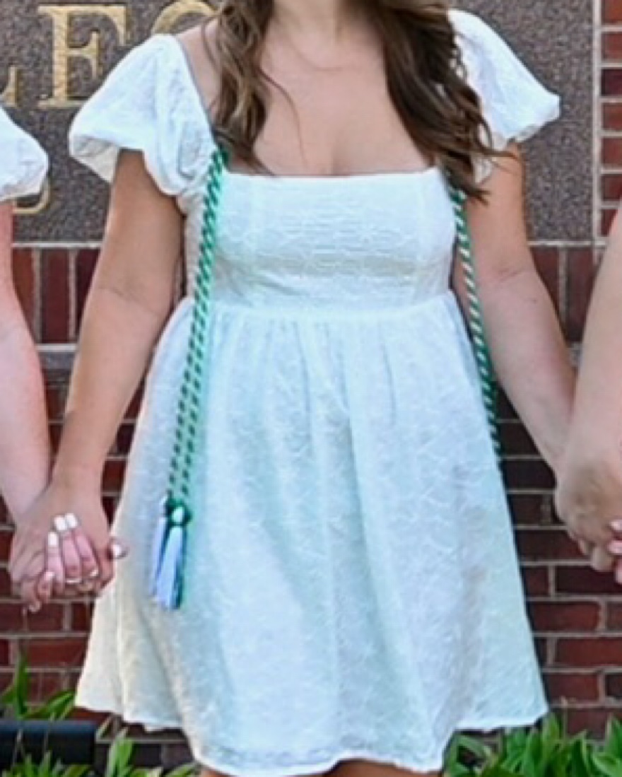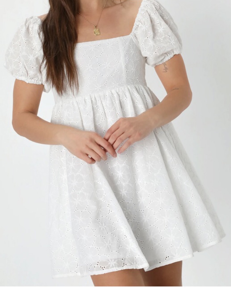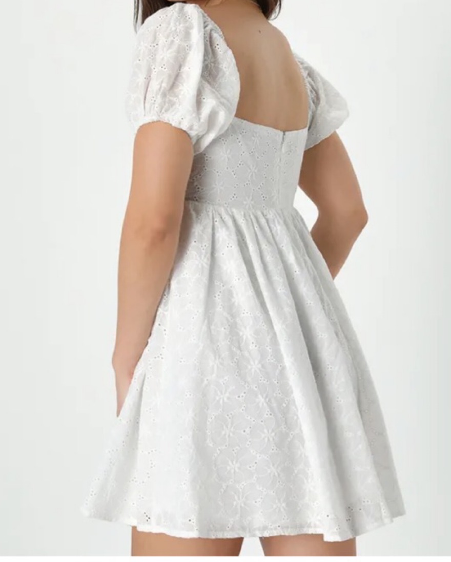 White eyelet dress with puff sleeves. Like new, no stains or damages. Only worn twice.