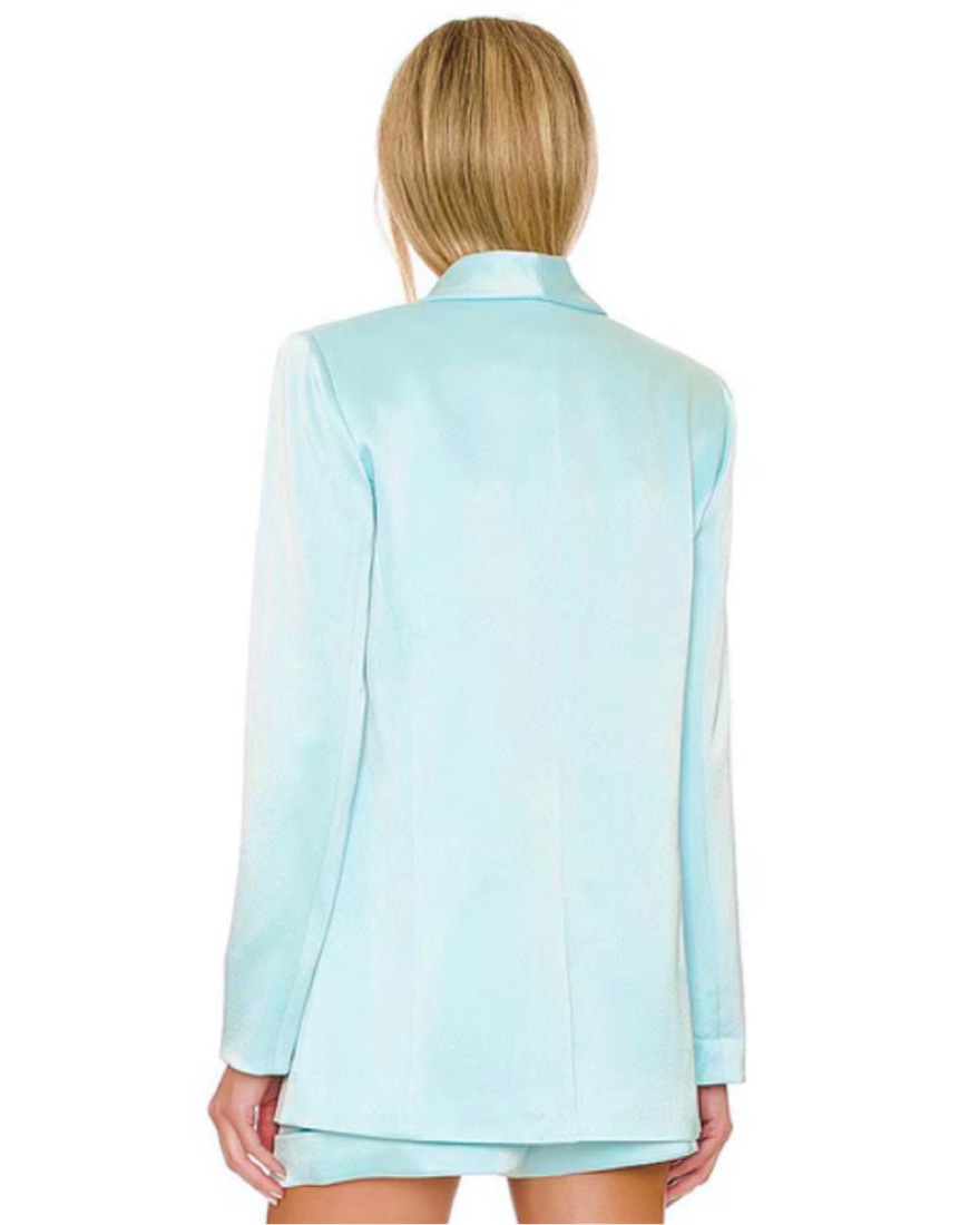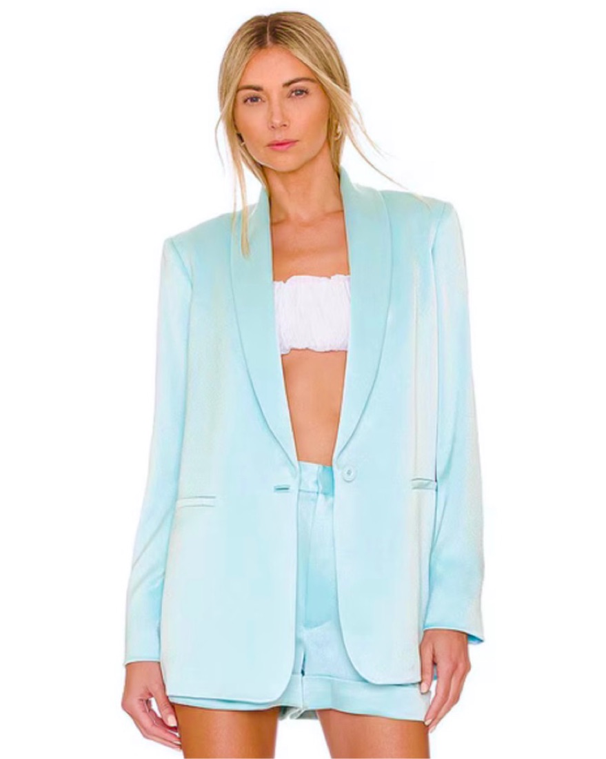 Beautiful teal/aqua colored set in luxurious silk. Blazer and suit shorts make this such a chic look!