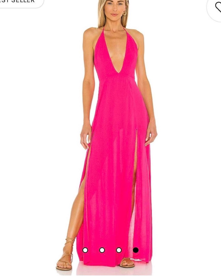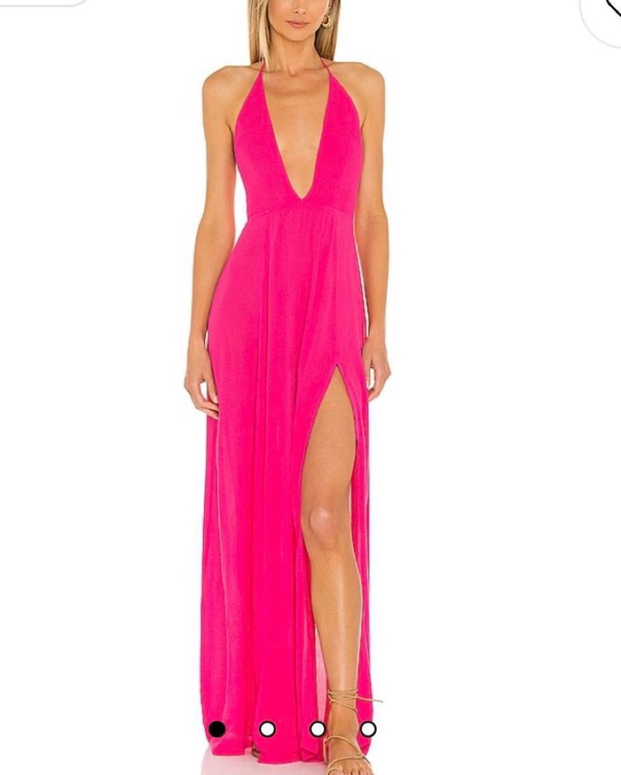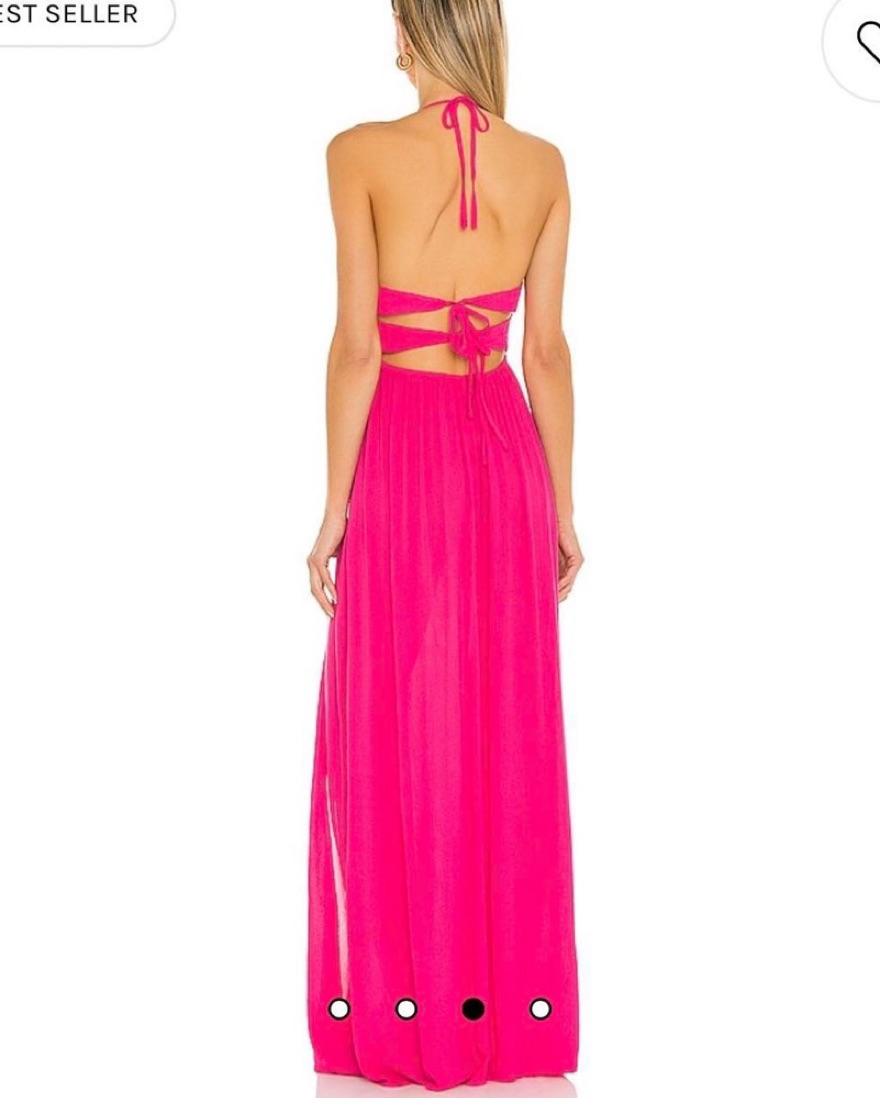 Self: 100% rayon Lining: 100% cotton Made in China Hand wash Partially lined Double back tie closures Adjustable halterneck tie closure Lightweight textured fabric Revolve Style No. SPDW-WD1610 Manufacturer Style No. SDD489 S19 #Pink #MaxiDress #SuperDown #Dress