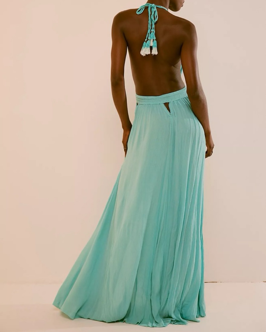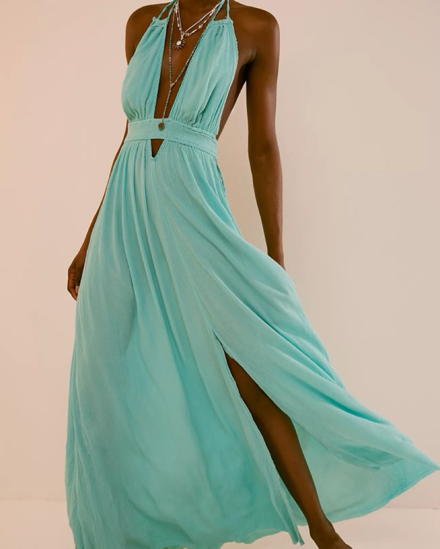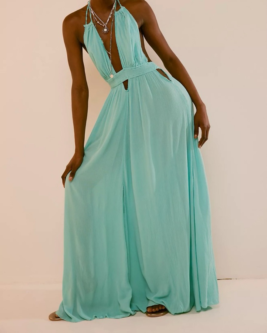 Sun goddess maxi in a crinkly crepe with a deep V-neck, adjustable rope halter, and stretchy smocked empire waist with geo cutout detailing below. Raw edges. We love tying the slit, and creating a knotted hem to change up the look. free-est Comprised of textured, free-flowing wardrobe staples, fre