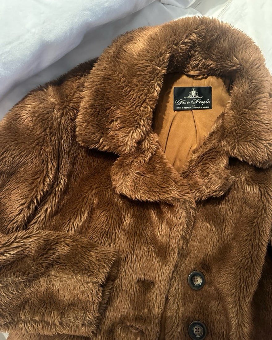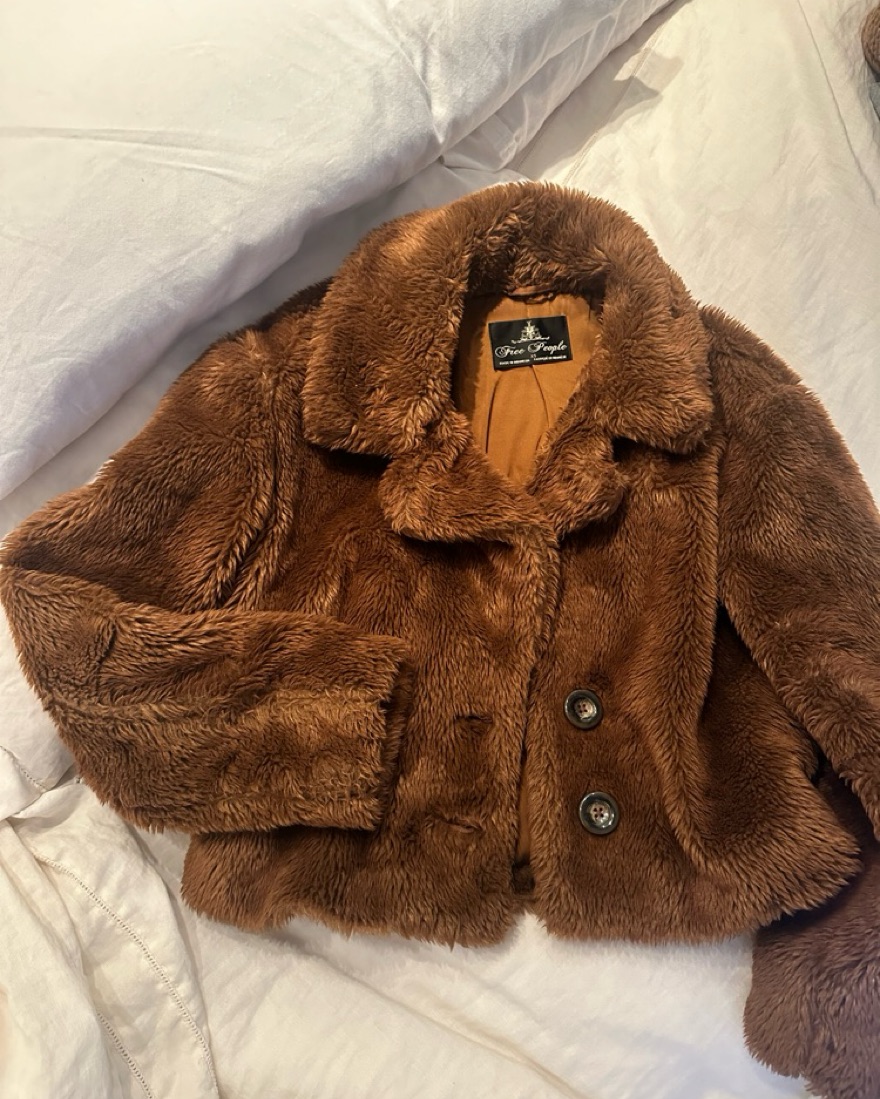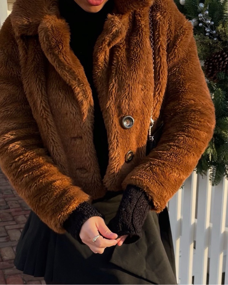 This coat hits right above the waist. It is perfect to style with a turtle neck and your favorite pair of jeans or mini skirt and boots!