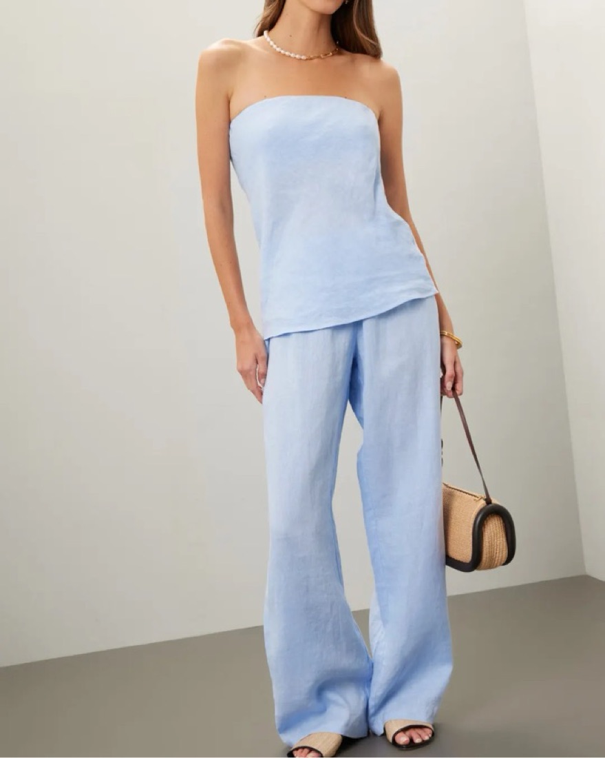 Elastic band linen pants and tube top set in light blue. Easy throw on