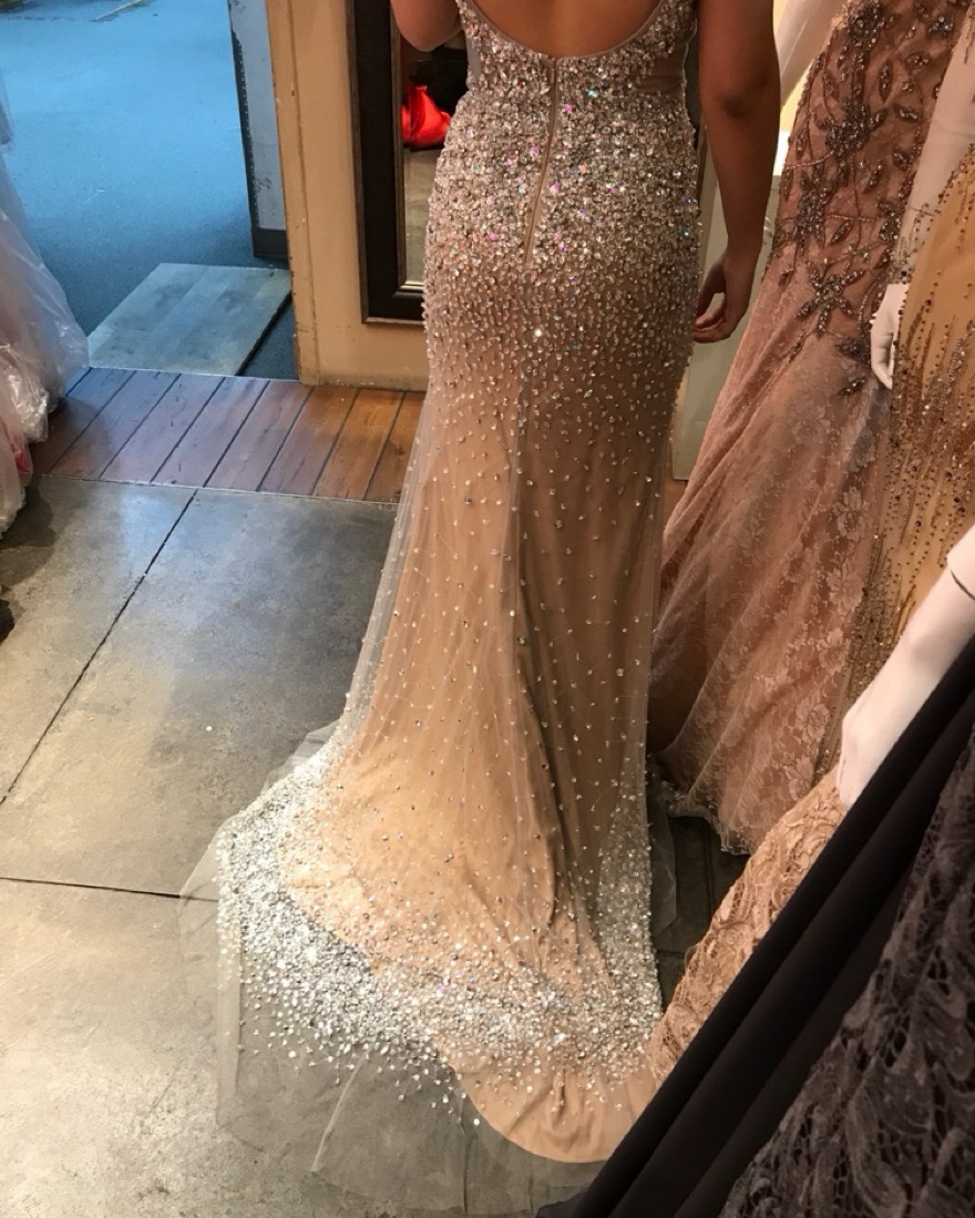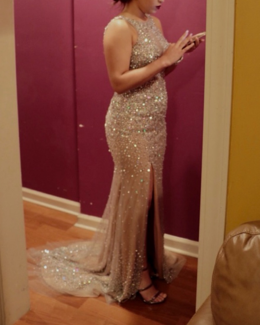 Beautiful party gown in sequin, beads and rhinestones with a tan background. Great for proms, weddings, birthdays, photo shoots, any party!