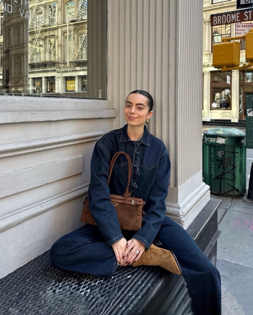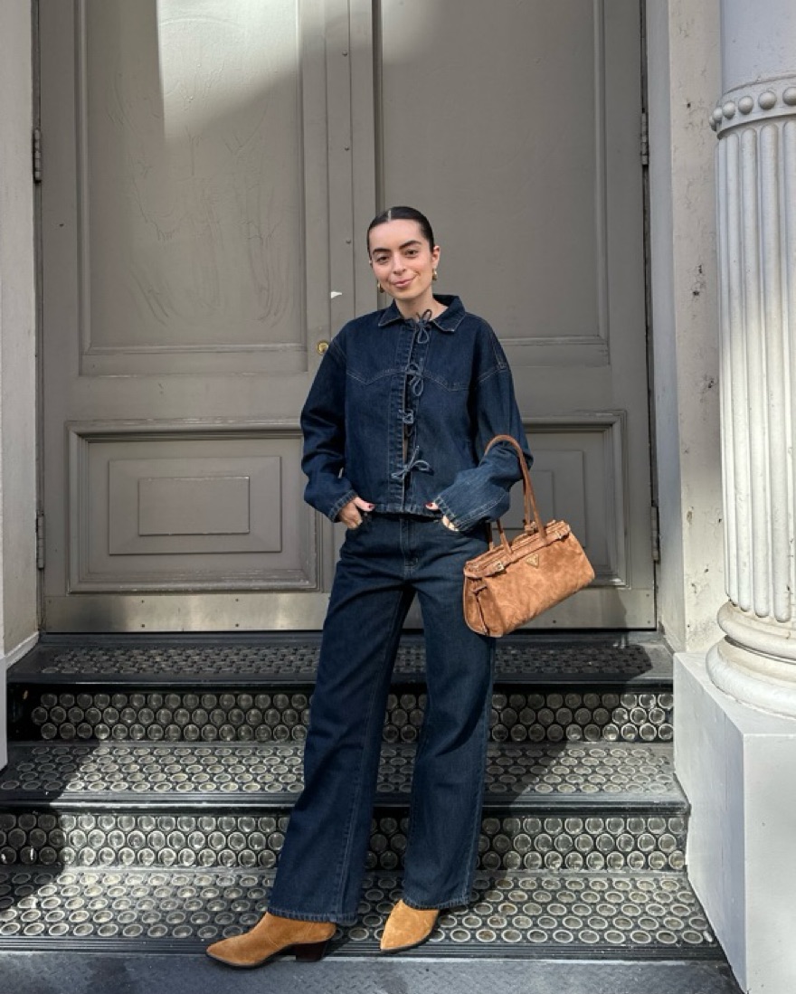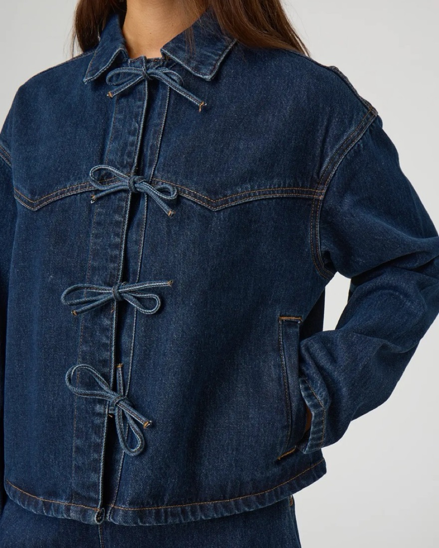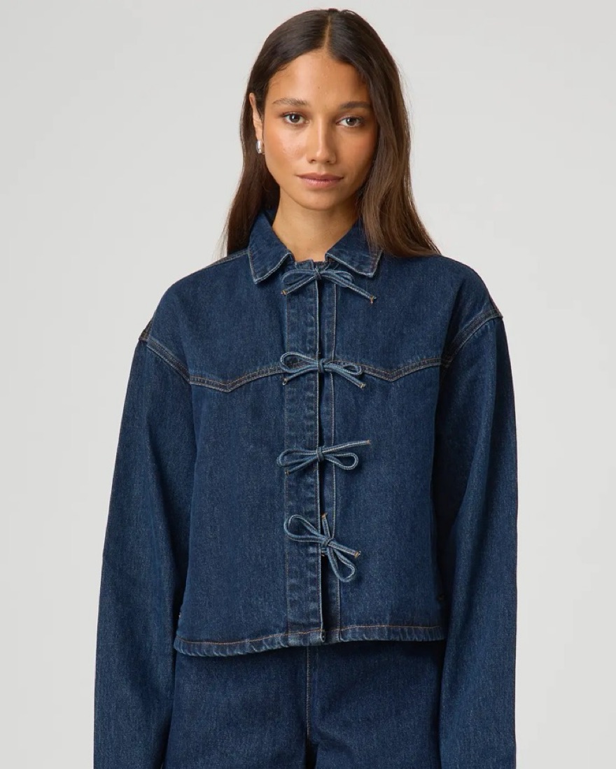 Renting my Denim Bow Jacket Denim Set comes with jeans in a size US 4 / NZ AU 8 they fit like a 2/25/26, jacket is a size small so cute for fall perfect denim outfit for a bachelorette