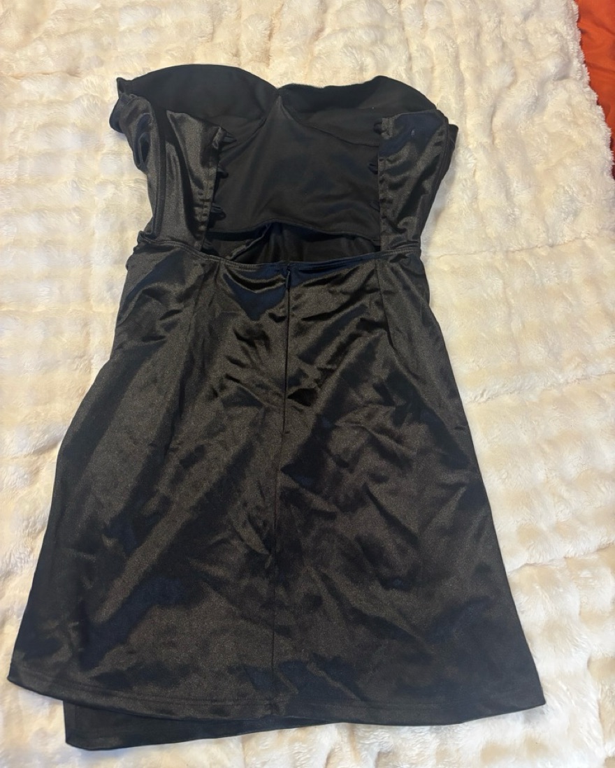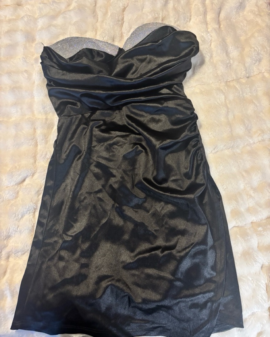 This stunning black satin mini dress is perfect for a night out on the town. The sweetheart neckline and ruched bodice create a flattering, figure-hugging silhouette.