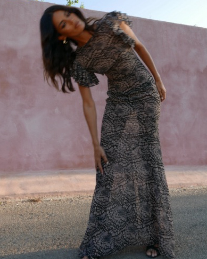 A new and exclusive De La Vali gown, The Bougainvillea Ruffle Maxi Dress has made its name as THE iconic dress for the summer wedding season and beyond. In a striking, fluid bias cut silhouette with elegant fishtail hemline and voluminous ruffle sleeve. UK: Size 6