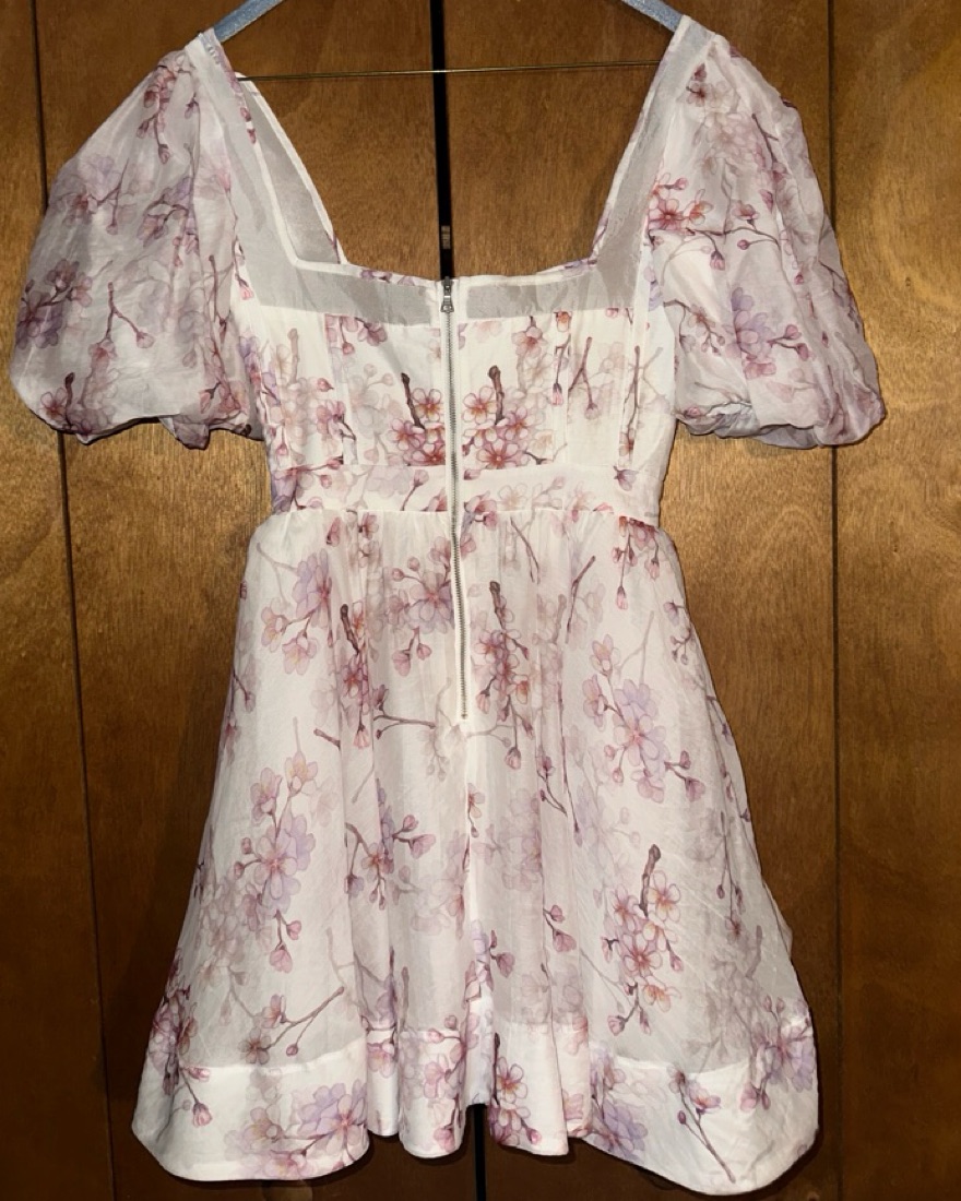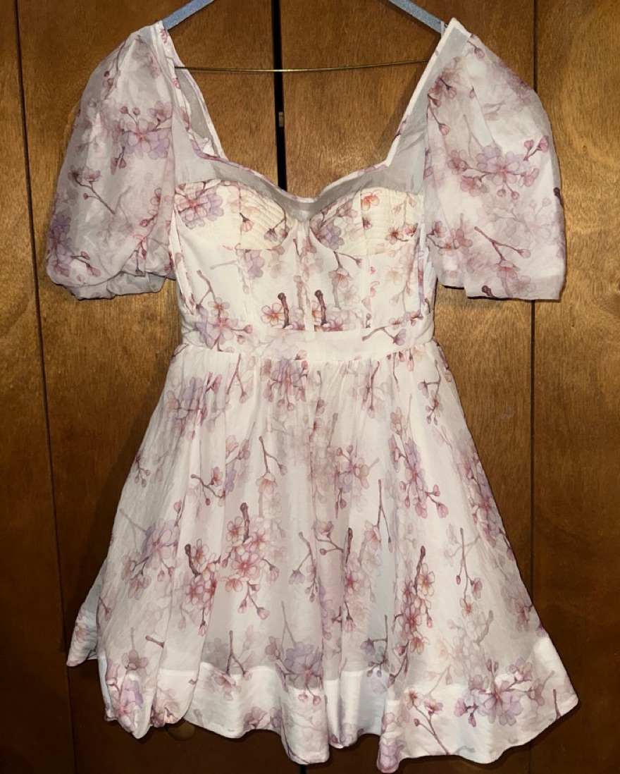 Pink cherry blossom mini dress. Corset style with puffy sleeve and mesh detailing. Perfect for a picnic or a garden party!