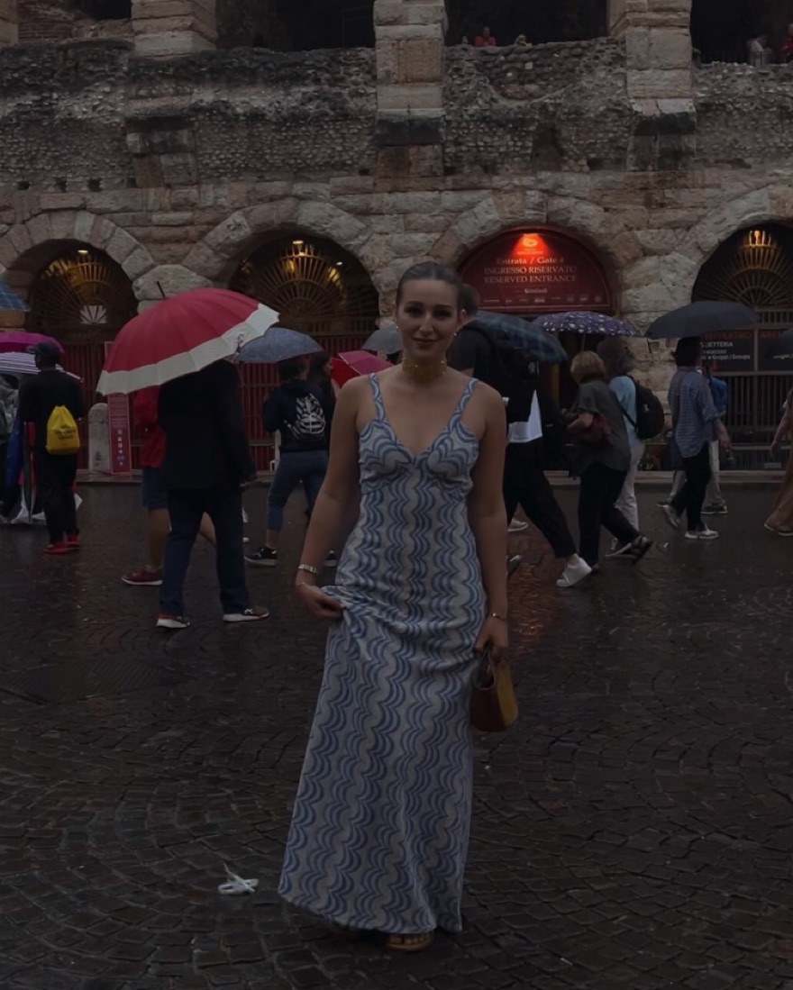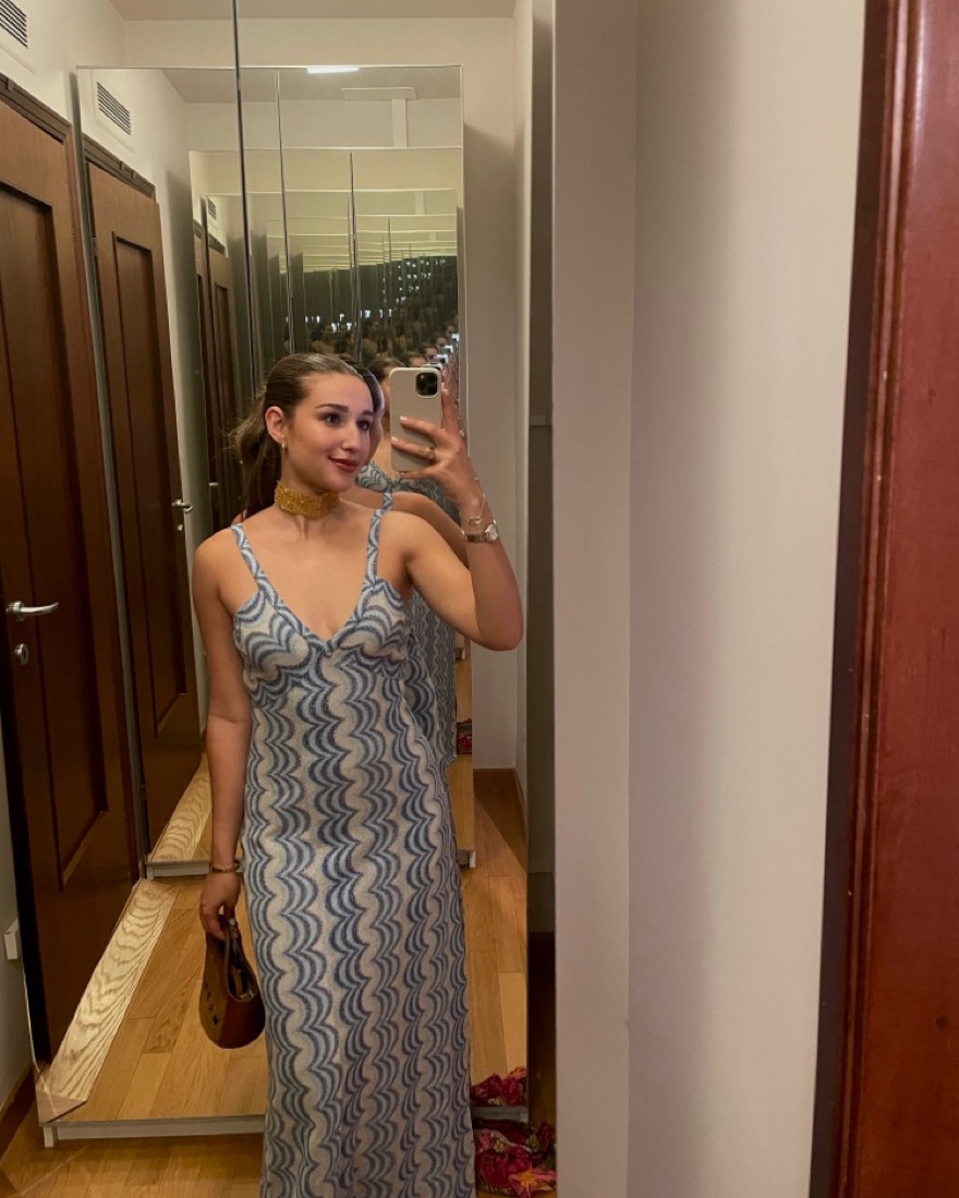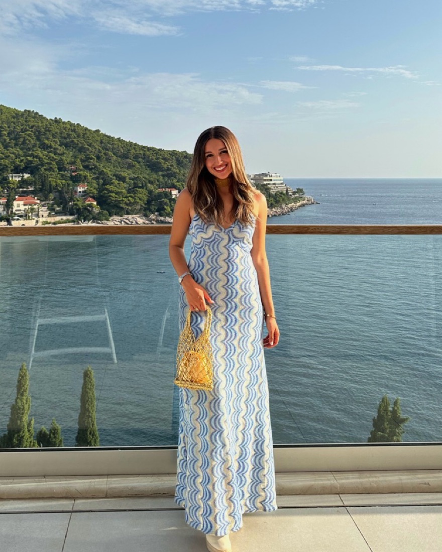 Ramy Brook GENEVIEVE dress- blue with gold details. Knitted texture, perfect for somewhere warm or wedding guest.