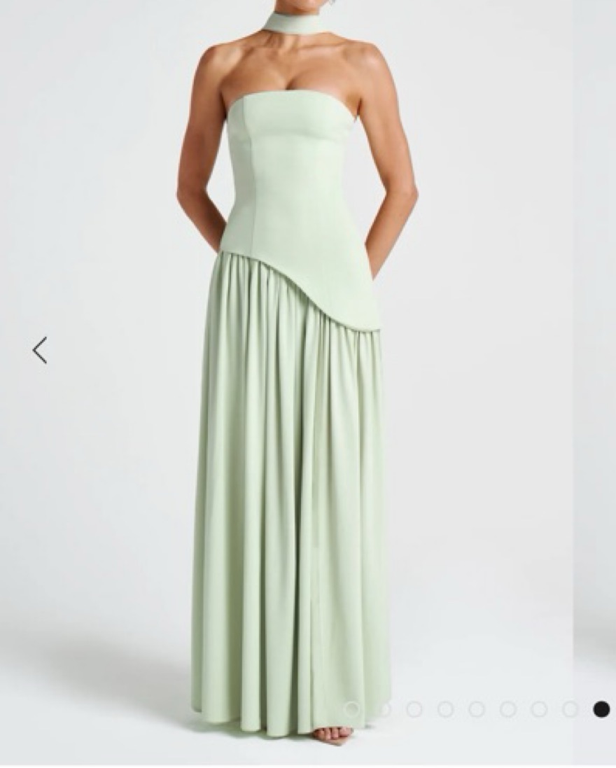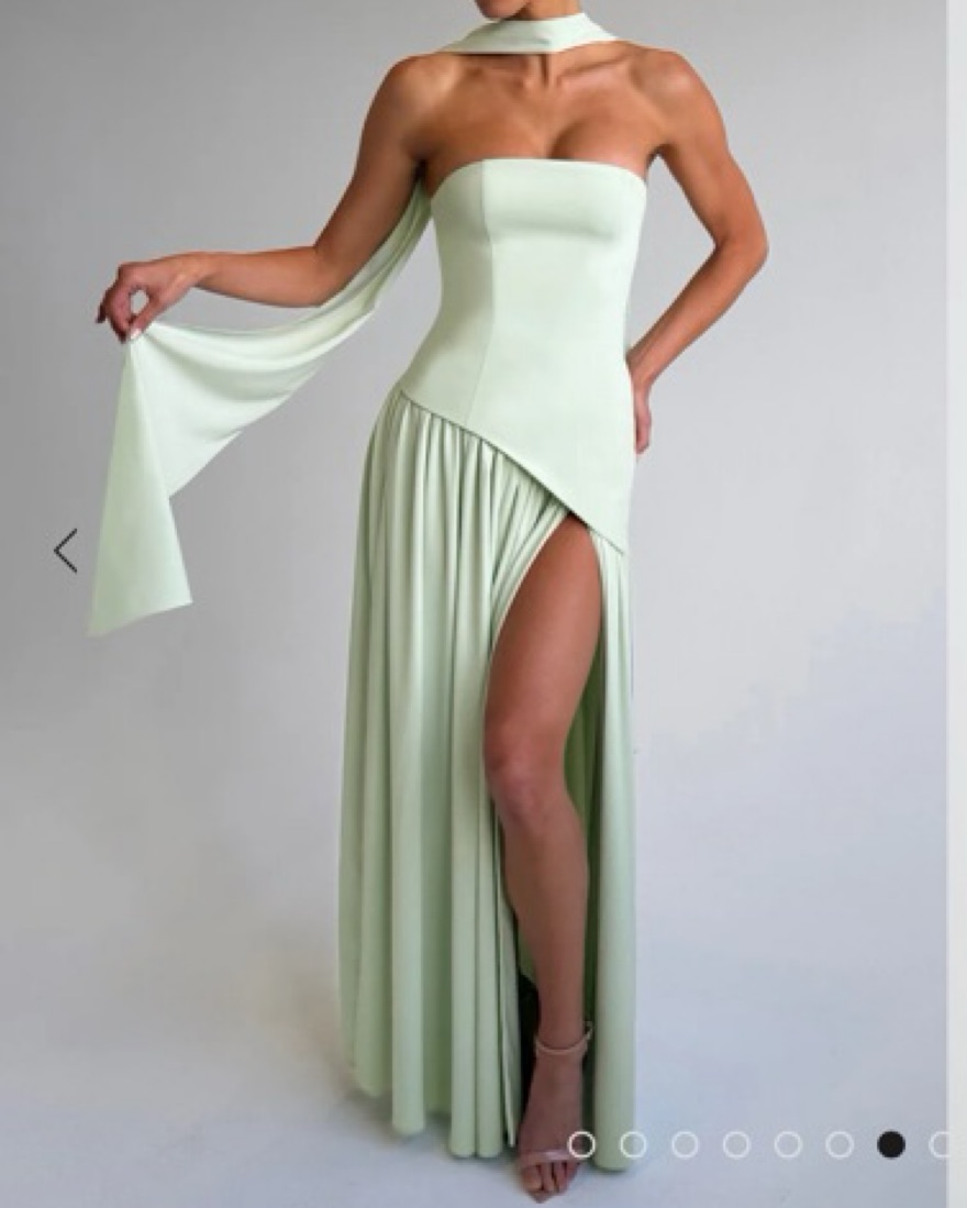 This stunning maxi dress is perfect for any formal occasion. The flowing, pleated skirt and high slit add a touch of drama and sophistication.