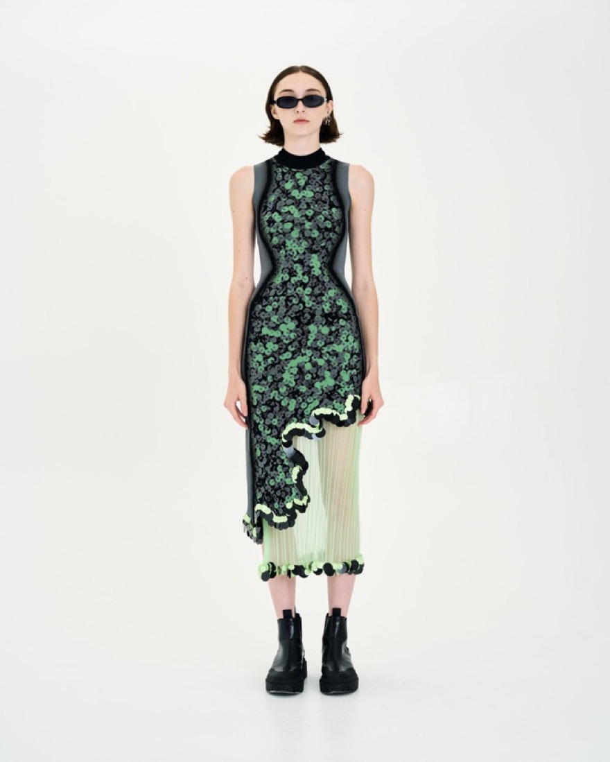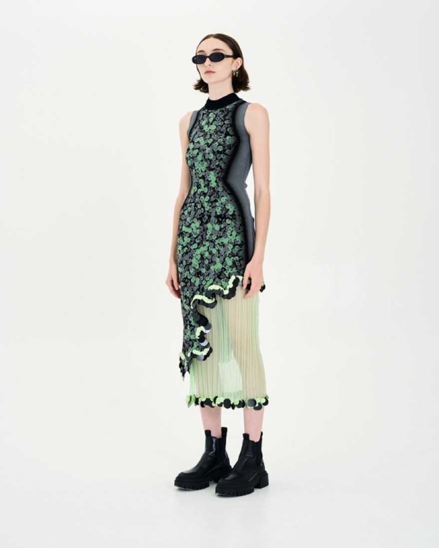 Signature wavy asymmetric dress in sustainably sourced yarns and recycled sequins. Side border details create a slimming optical illusion, while the sequins print and wavy hem steal the show.