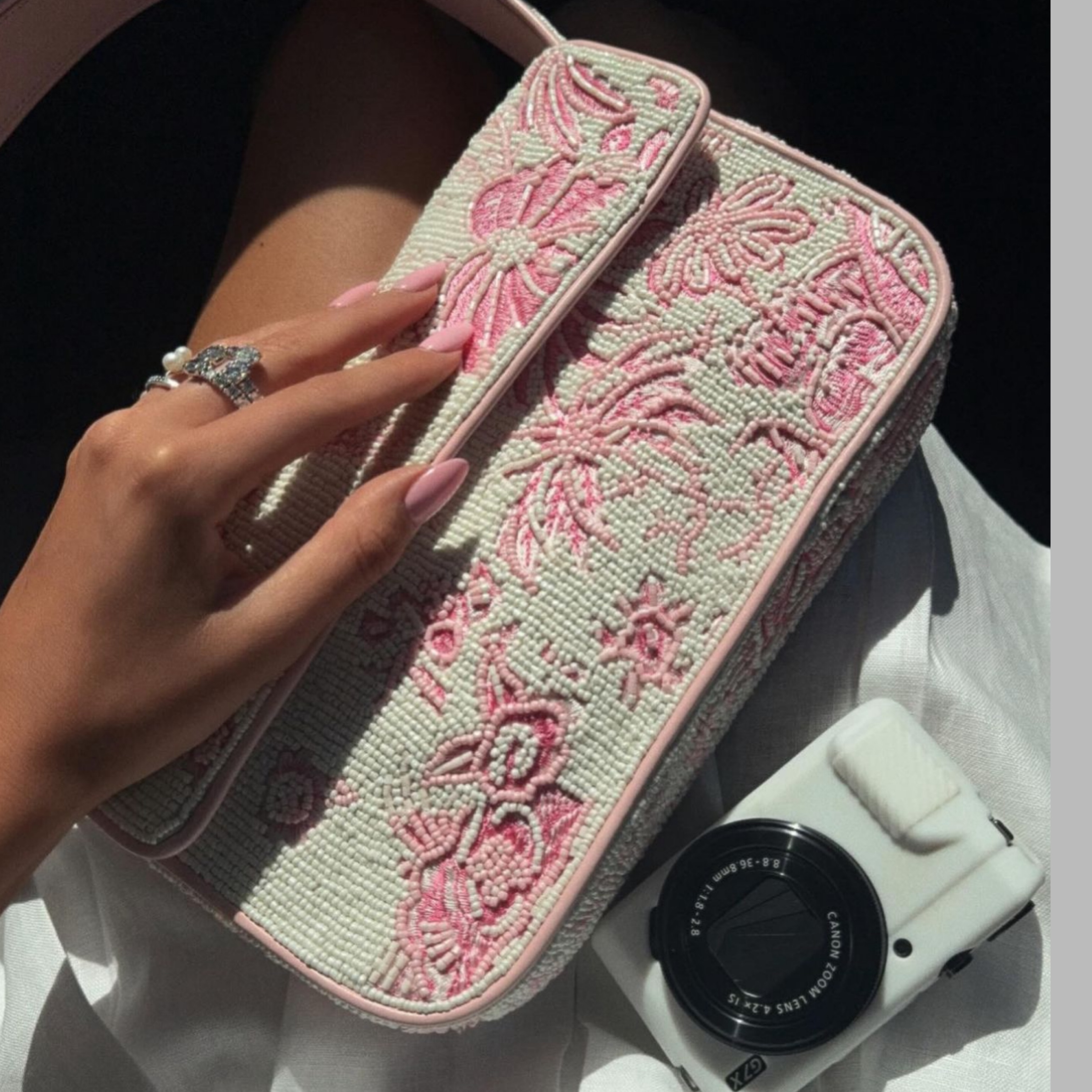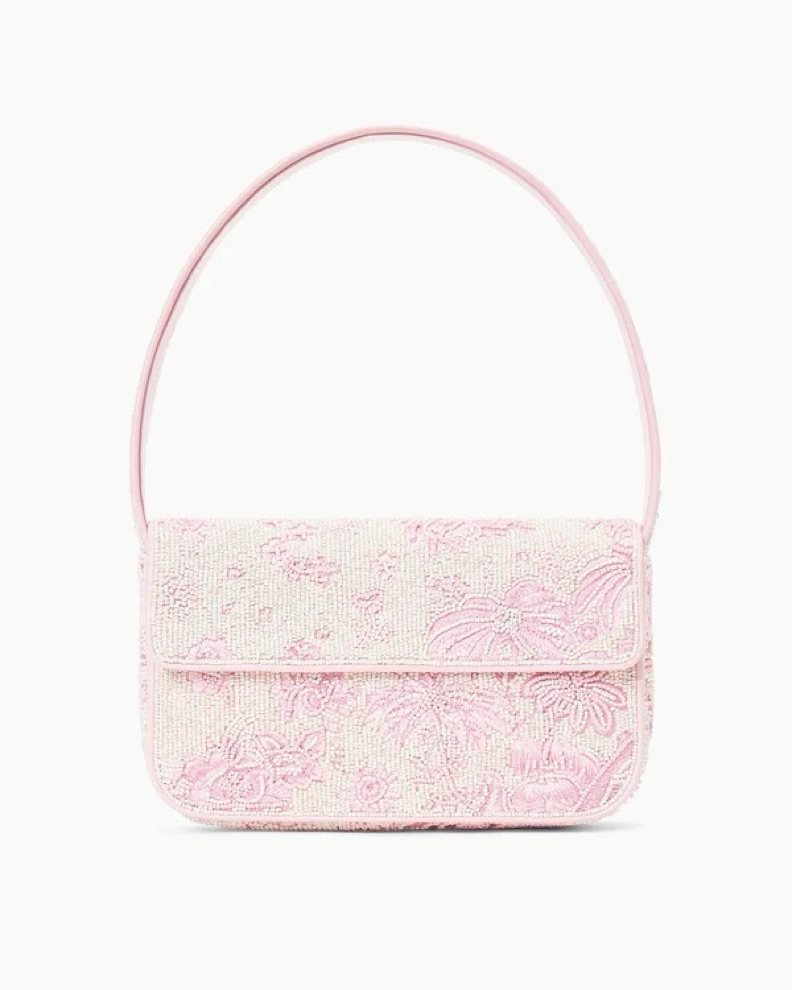 Was out of stock for monthsLight baby Pink staud beaded bag + purse - the best-selling Tommy Bag is a hand-beaded shoulder bag with vegan leather piping. This style features a single flap closure, inner zip pouch and magnetic pocket on the back. Purse, shoulder bag, bridal, spring purse