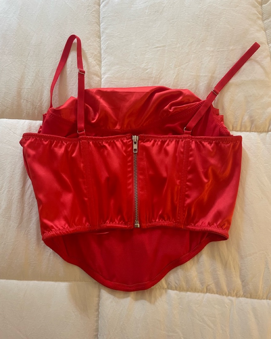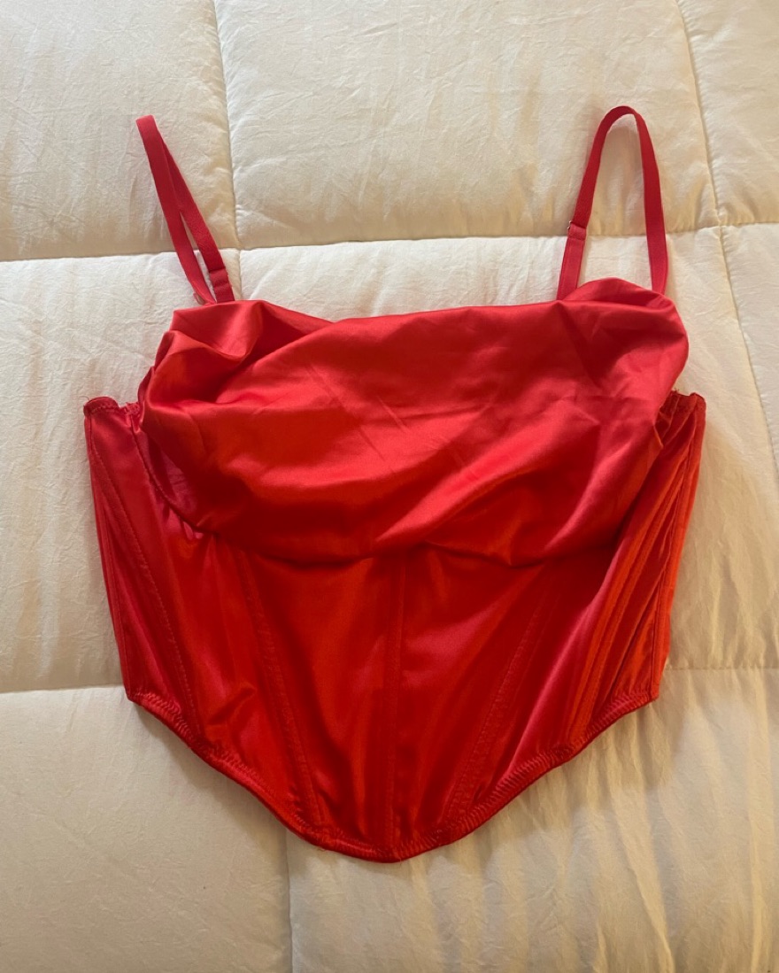Red satin corset top from urban outfitters. Adjustable straps! Super cute and flattering.