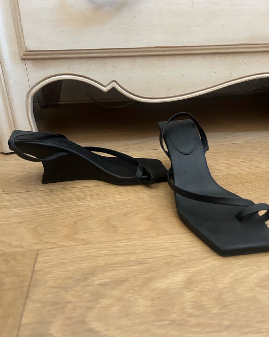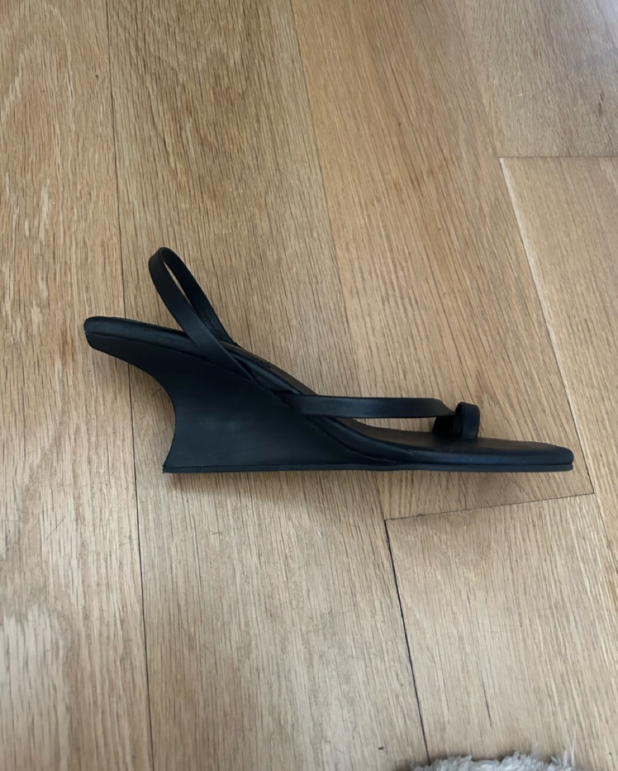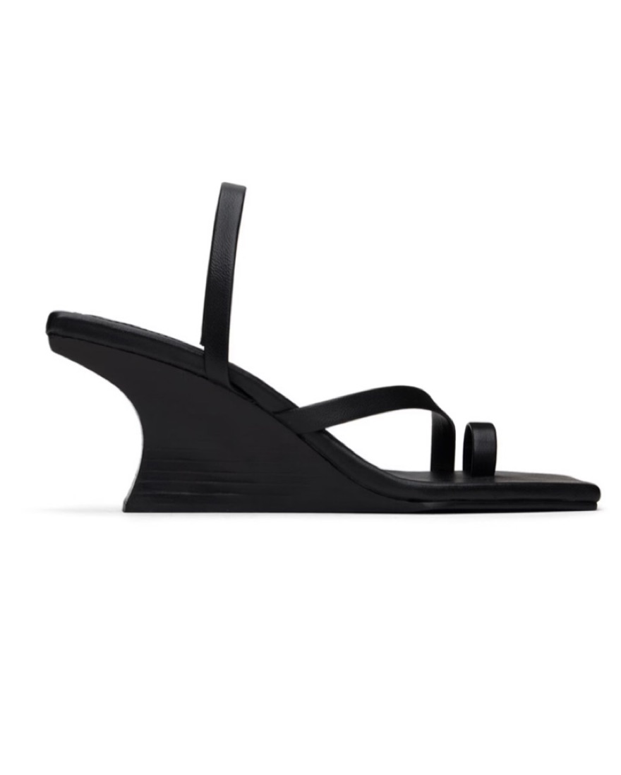 Chrome-free-dyed LWG-certified grained sheepskin heeled sandals in black.