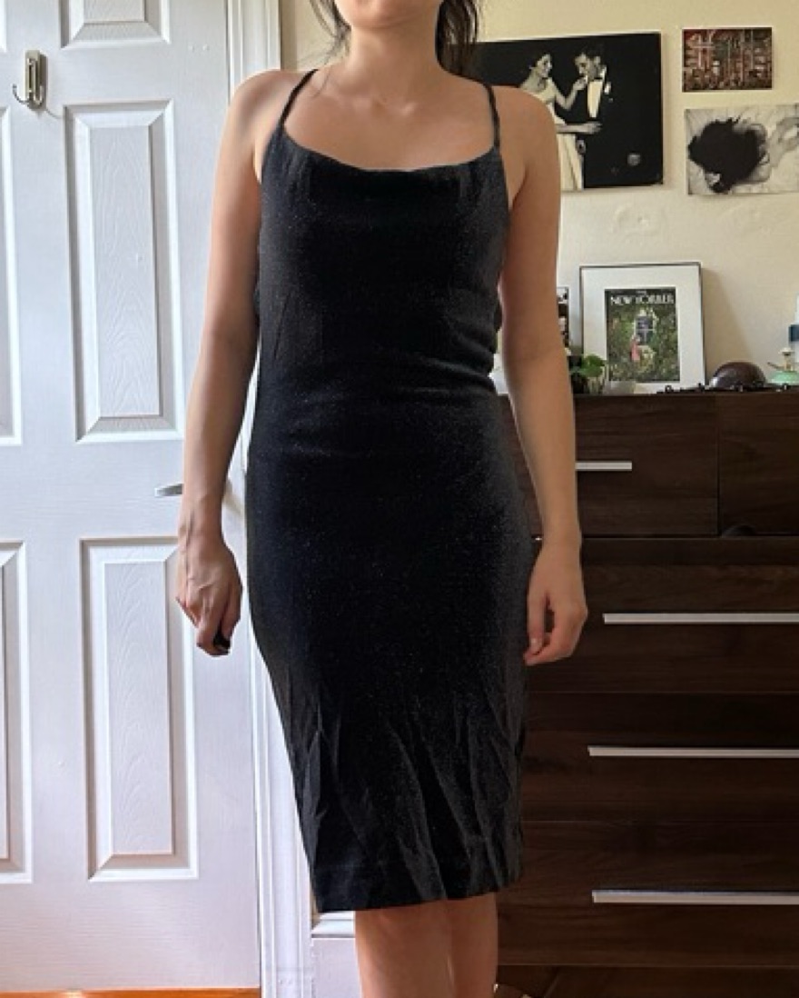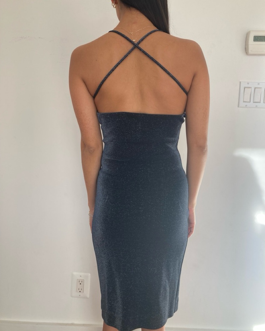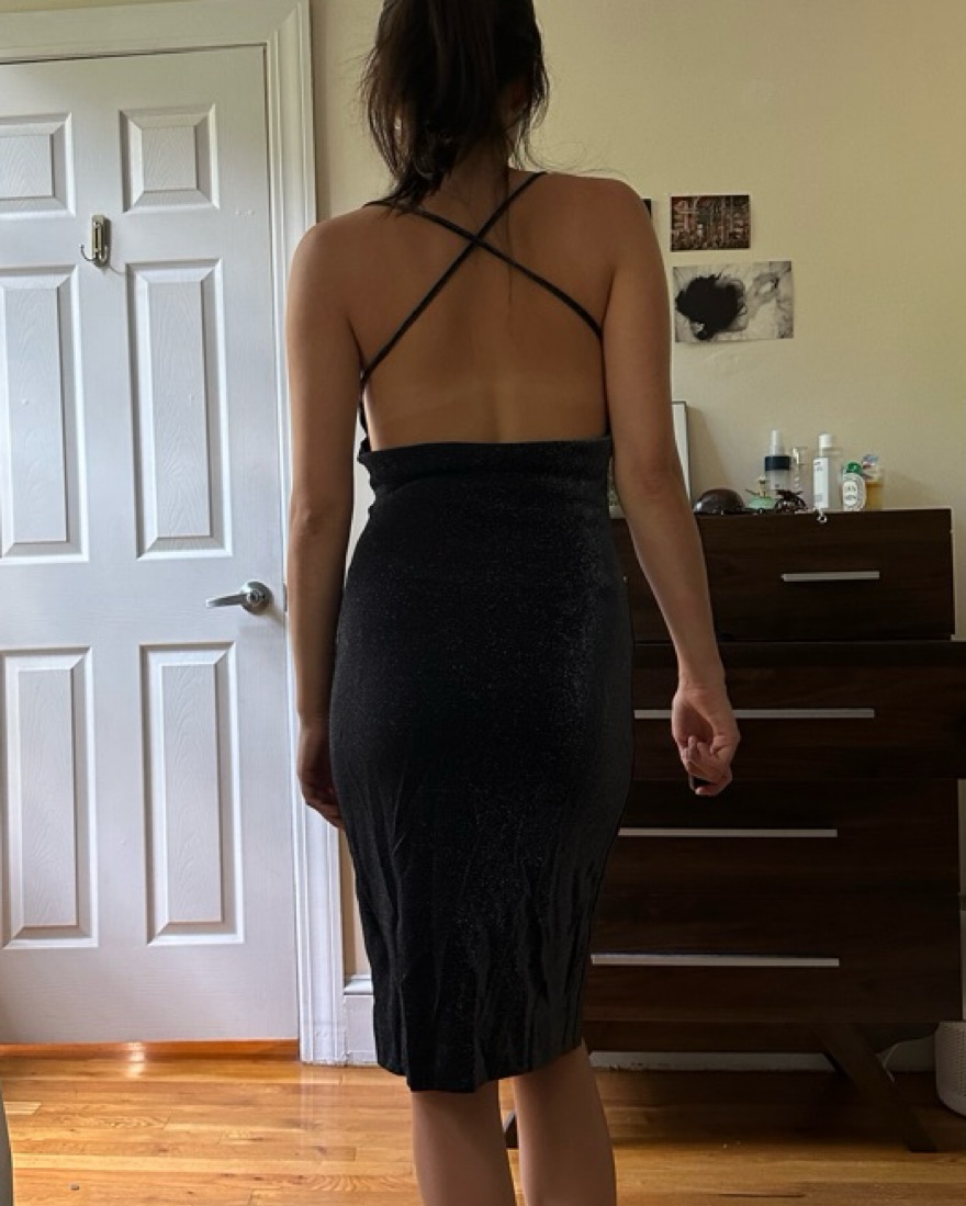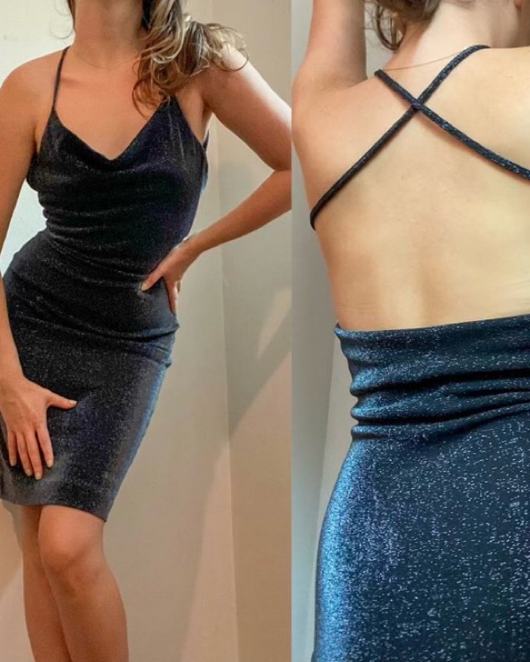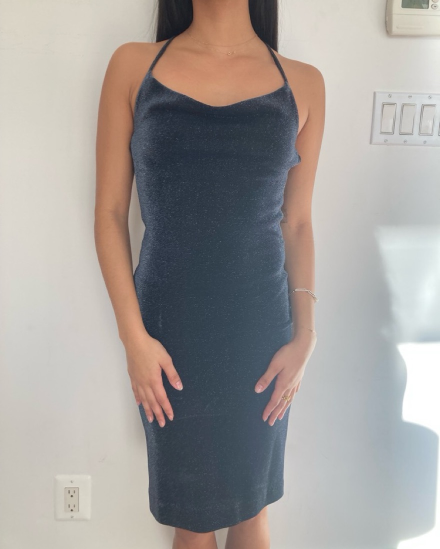 Slight sparkly texture with a small cowl neck and crossover straps in the back. Backless - fits a small and medium with cross stretch