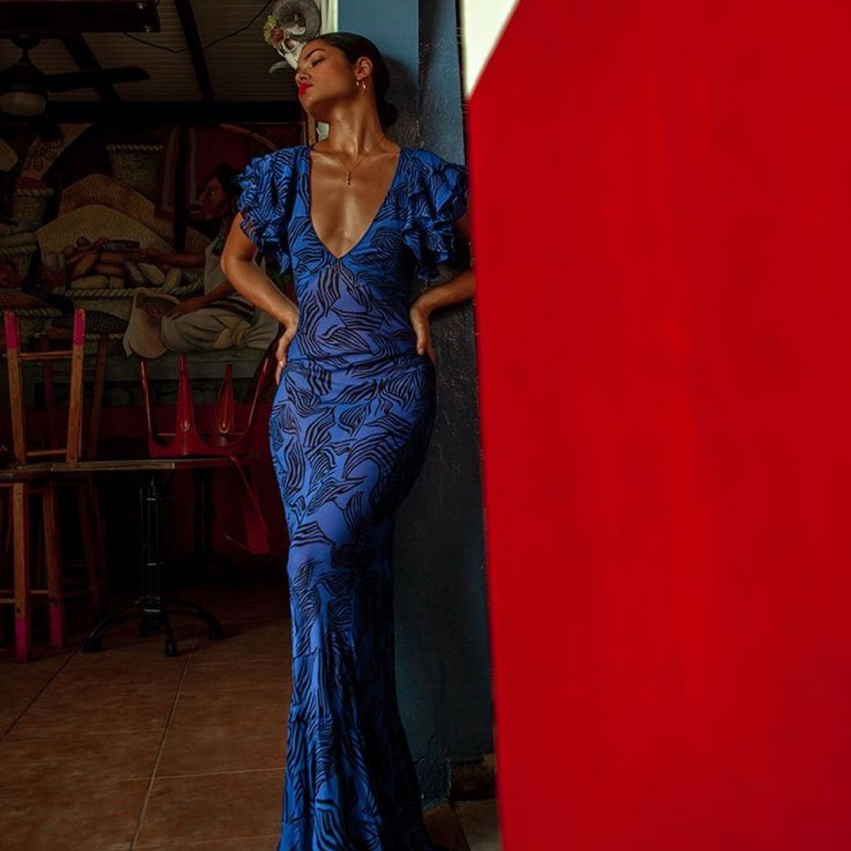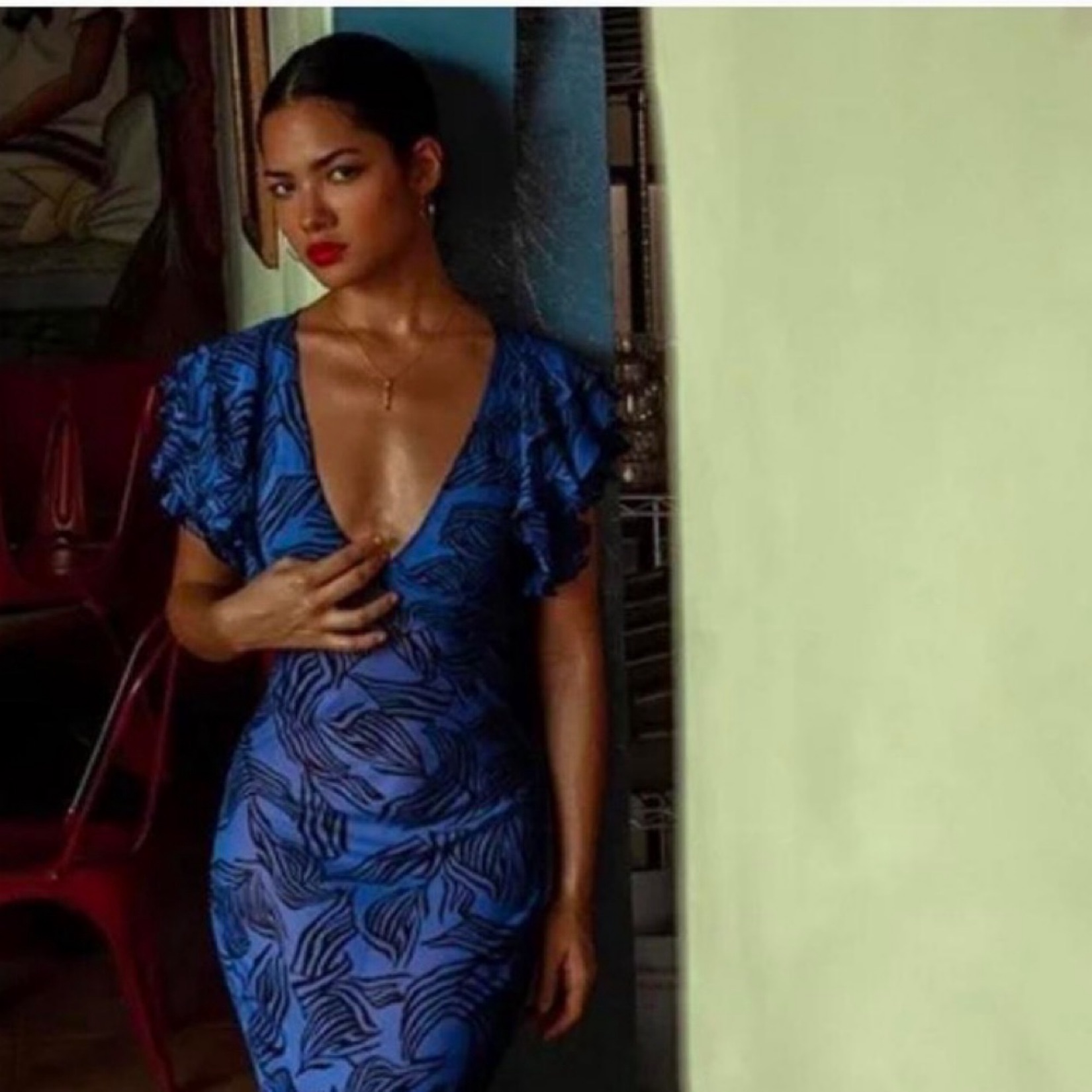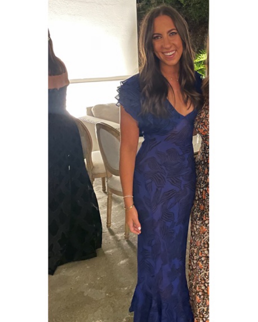 This gown is beautiful and perfect for a wedding guest. Please note the dress is sheer but works with nude shapewear underneath.