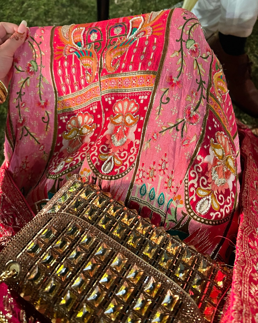 Beautiful pink and gold lehenga, hand beaded details! A tiny bit long on me at 5’4”, but still able to make it work with heels. Would be perfect on someone taller.