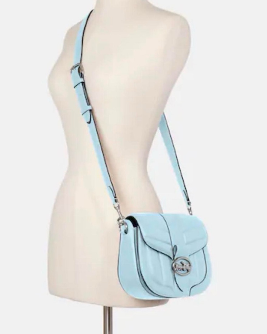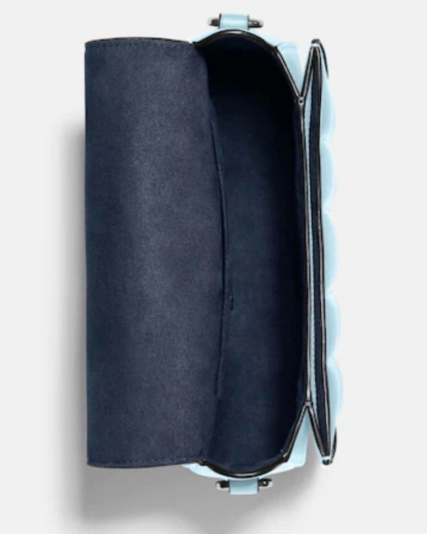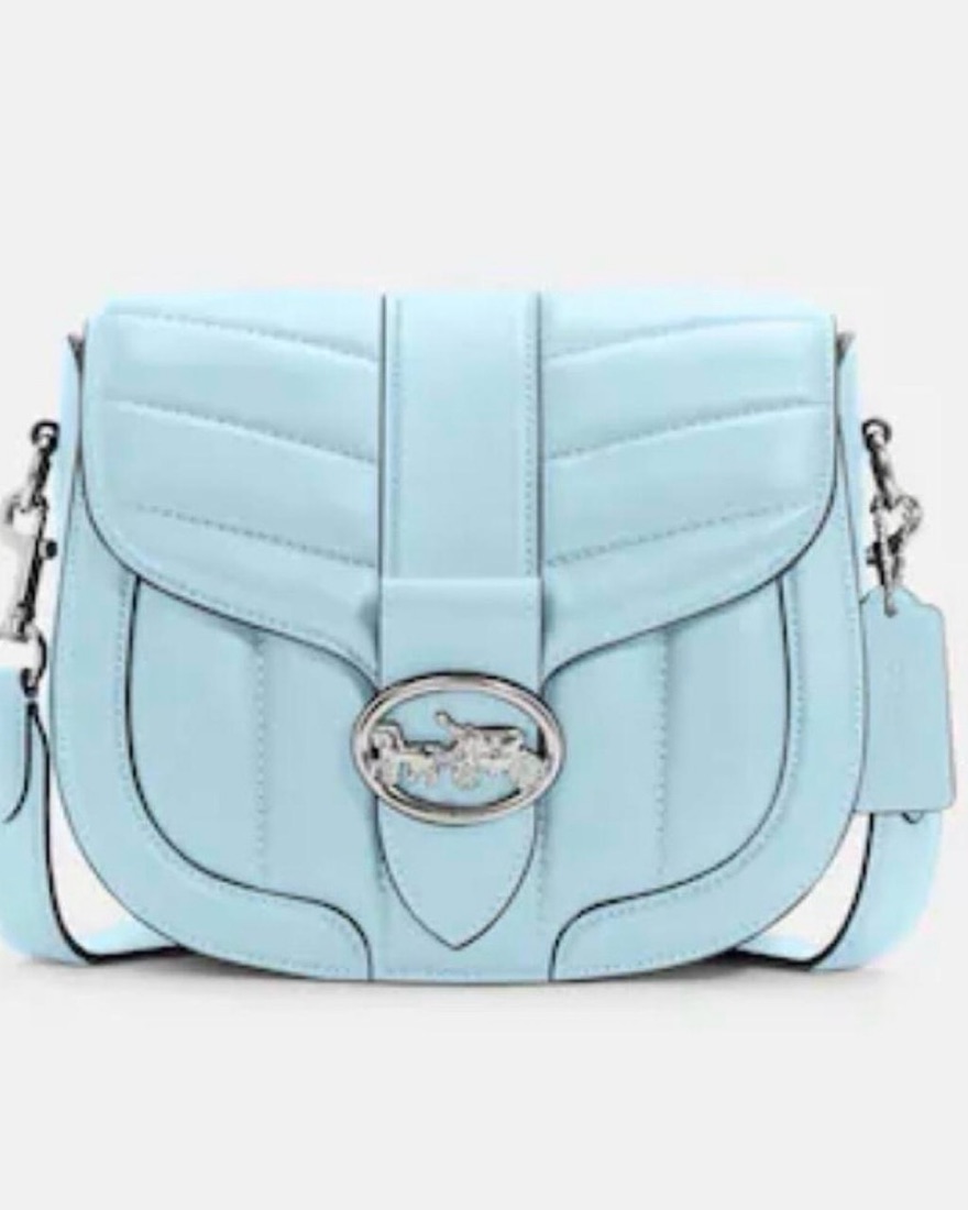 Coach Baby Blue Georgie Crossbody Bag With Puffy Quilting Like new condition; only worn a few times Nappa leather and smooth leather Inside multifunction pockets Snap closure, fabric lining Outside open pocket Detachable strap with 20 3/4" drop for shoulder or crossbody wear 8 1/4" (L) x 6 3/4" (