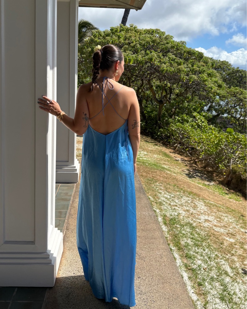 gorgeous bright blue silk shift dress with open back. Anna October collab with J Crew. size XS but fits up to a medium