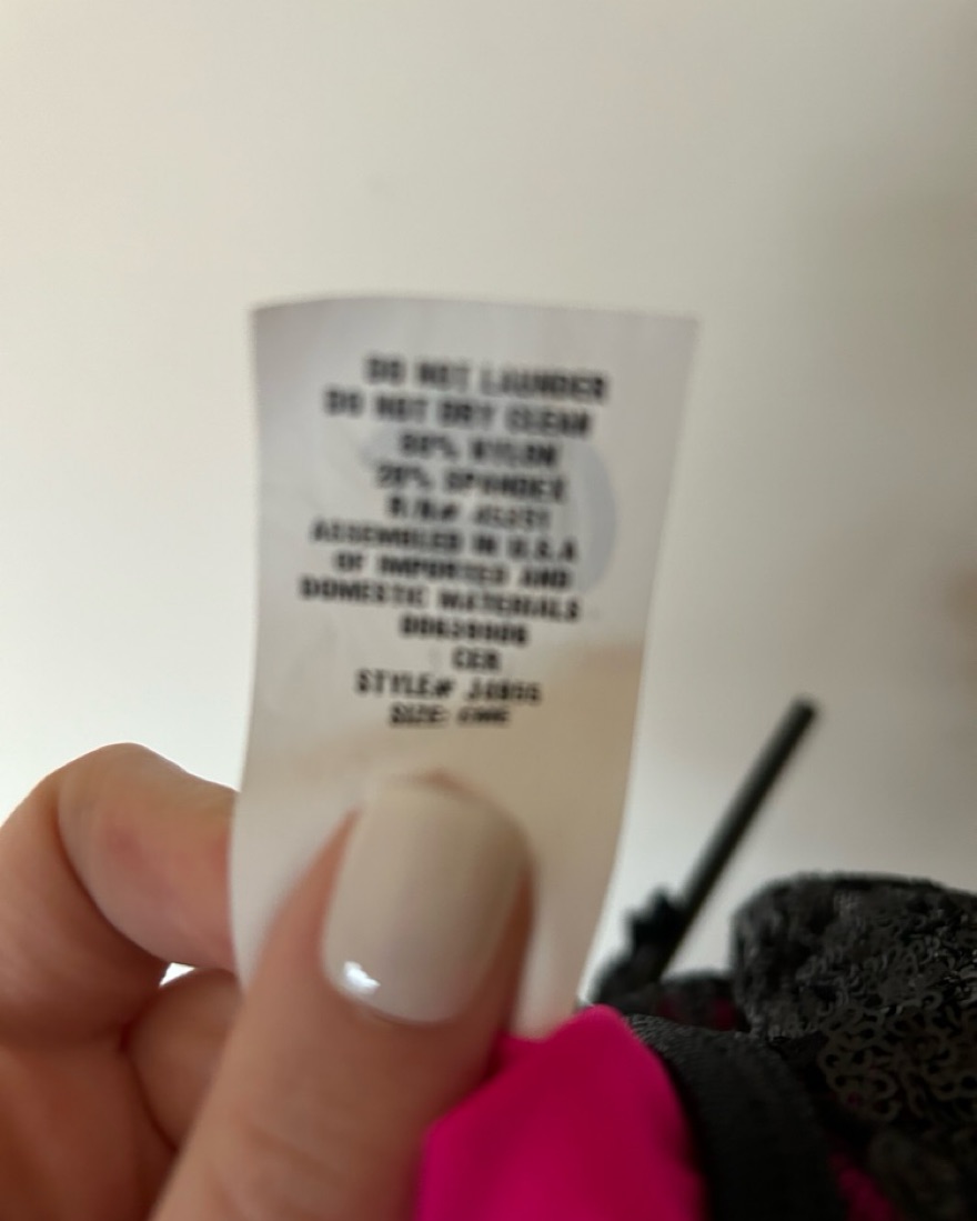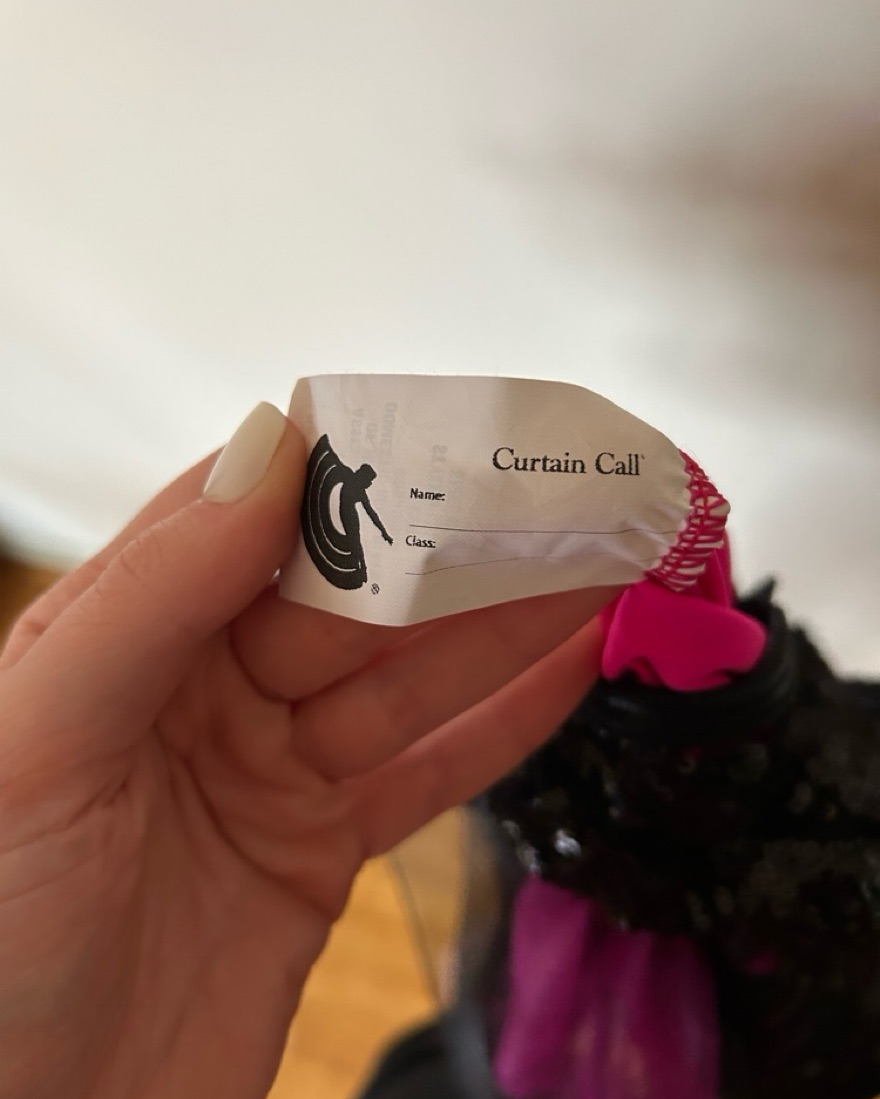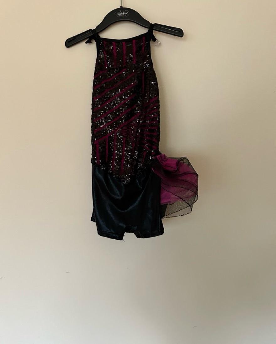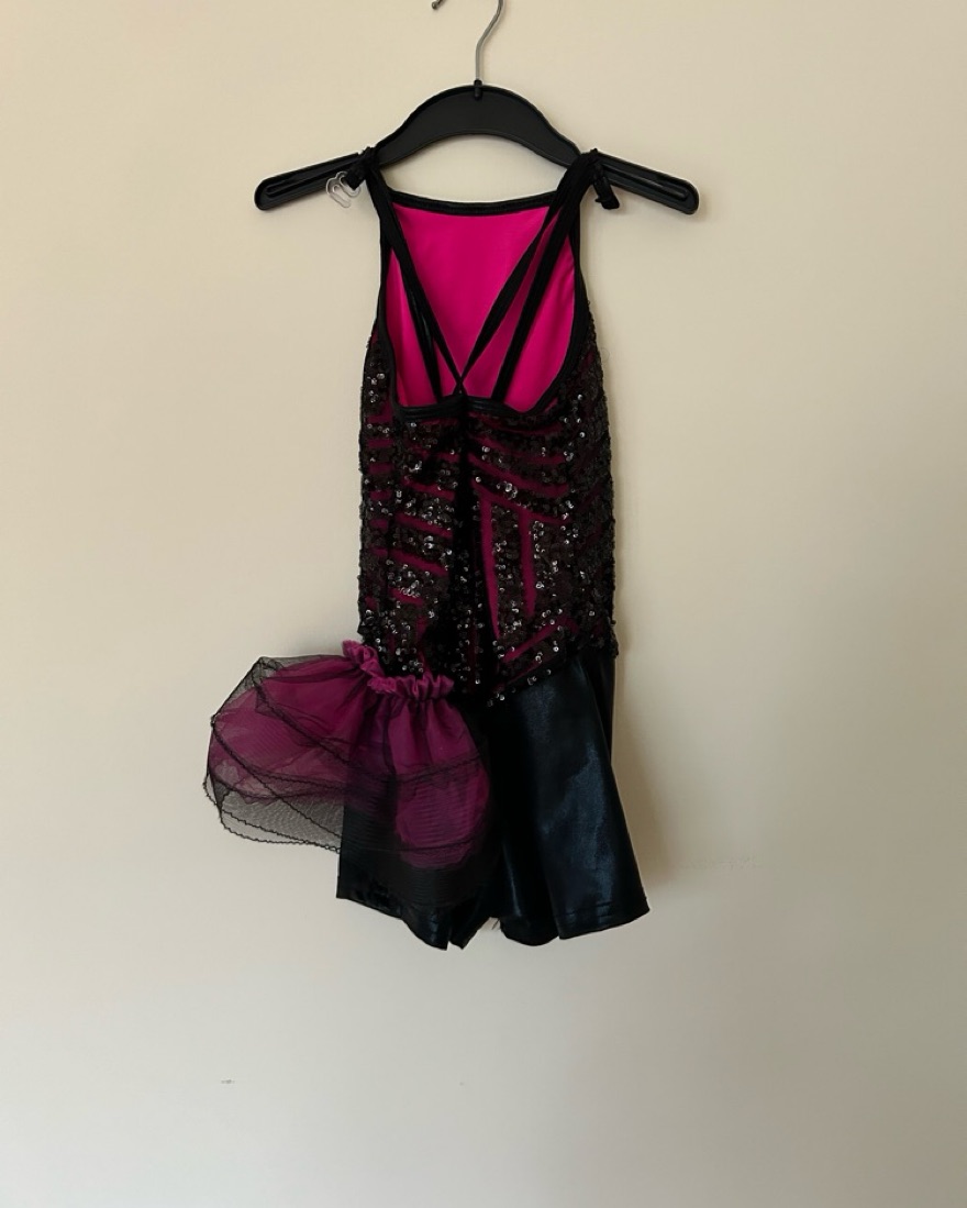 Hot pink and black bikertard with black and pink tule ball on left side. This is a halter style costume and the brand is Curtain Call. This is a very very small costume and is around an XS size.