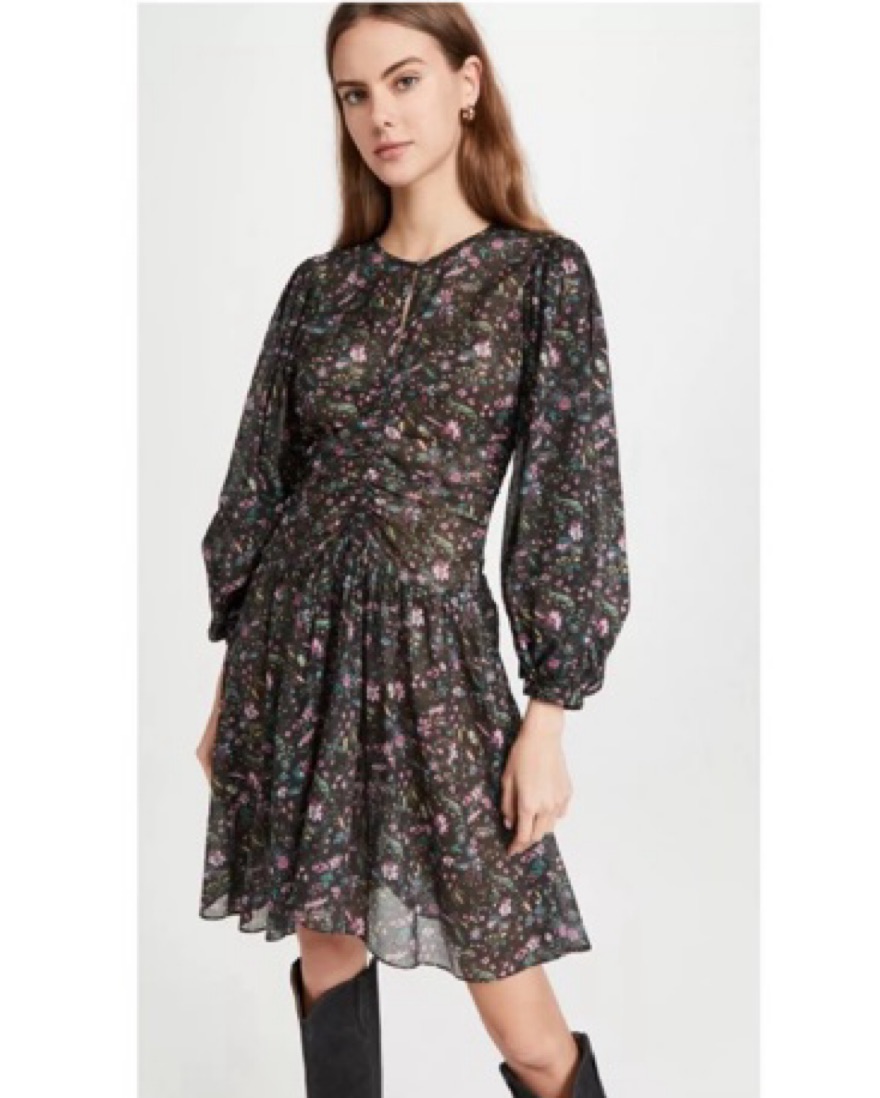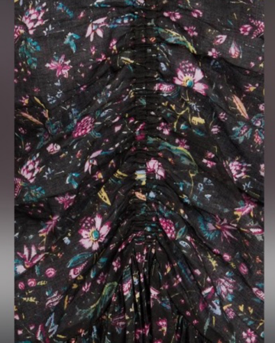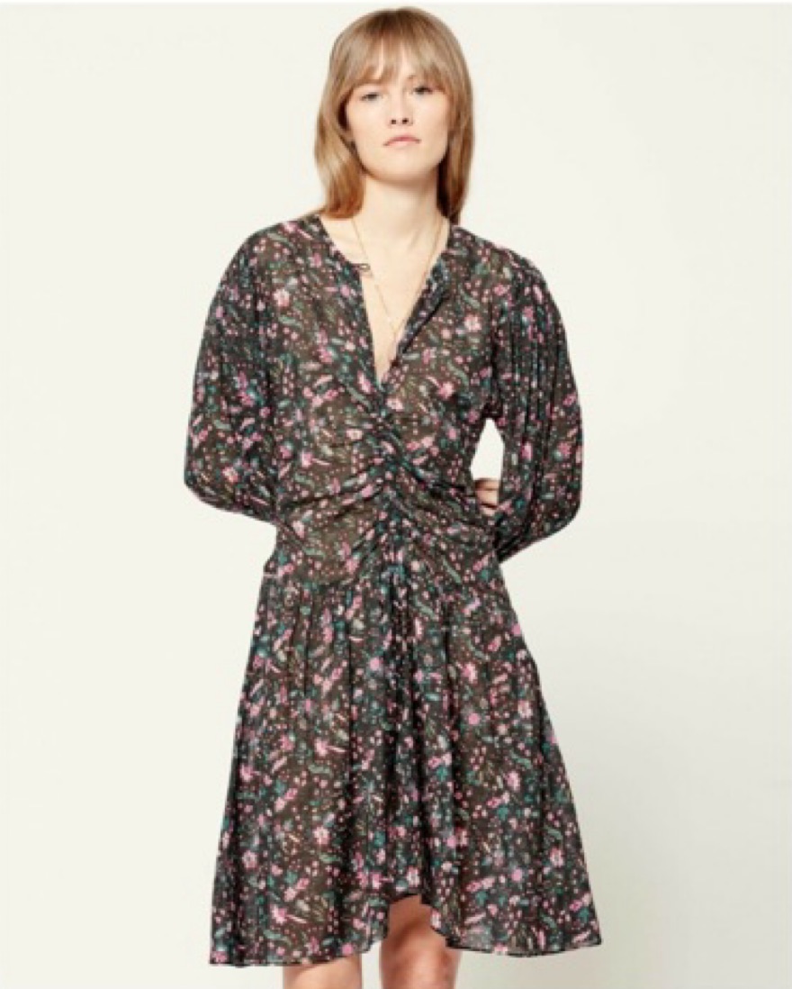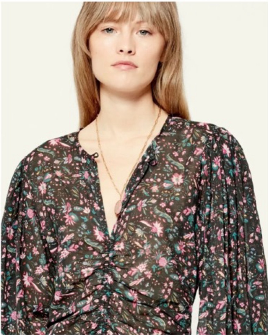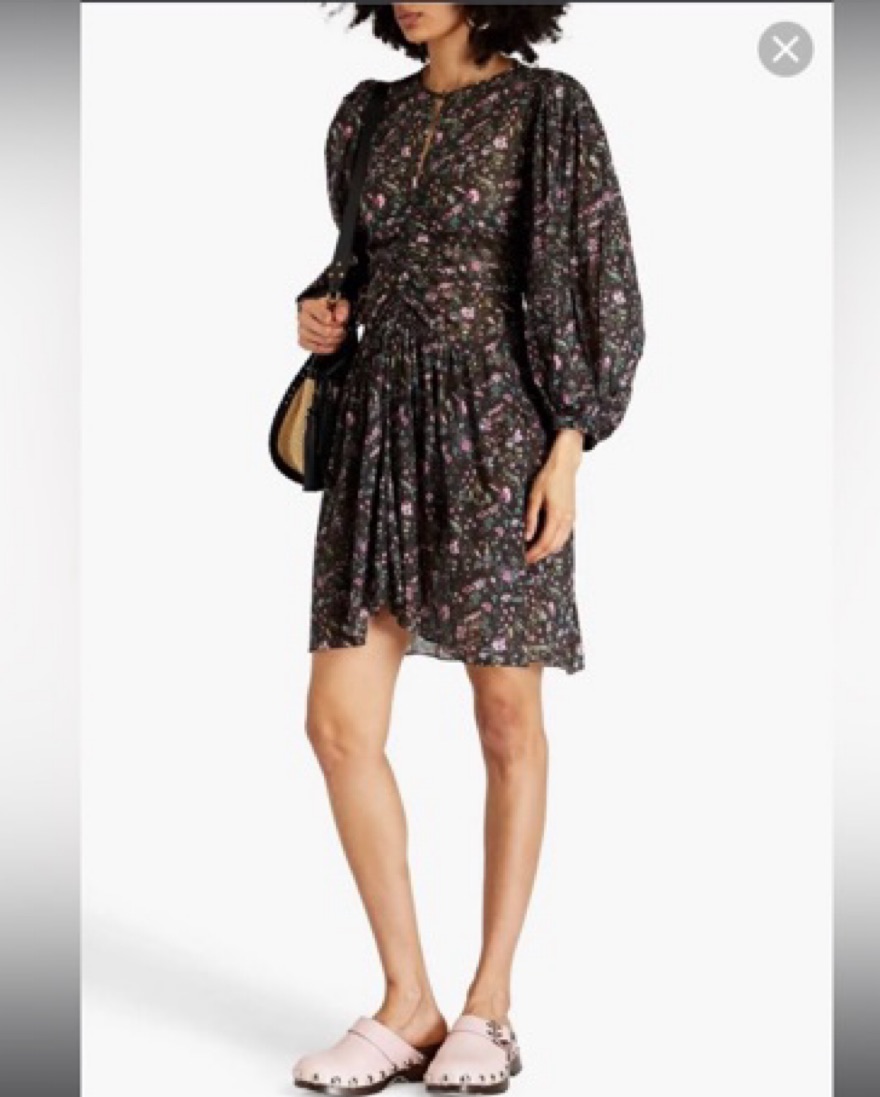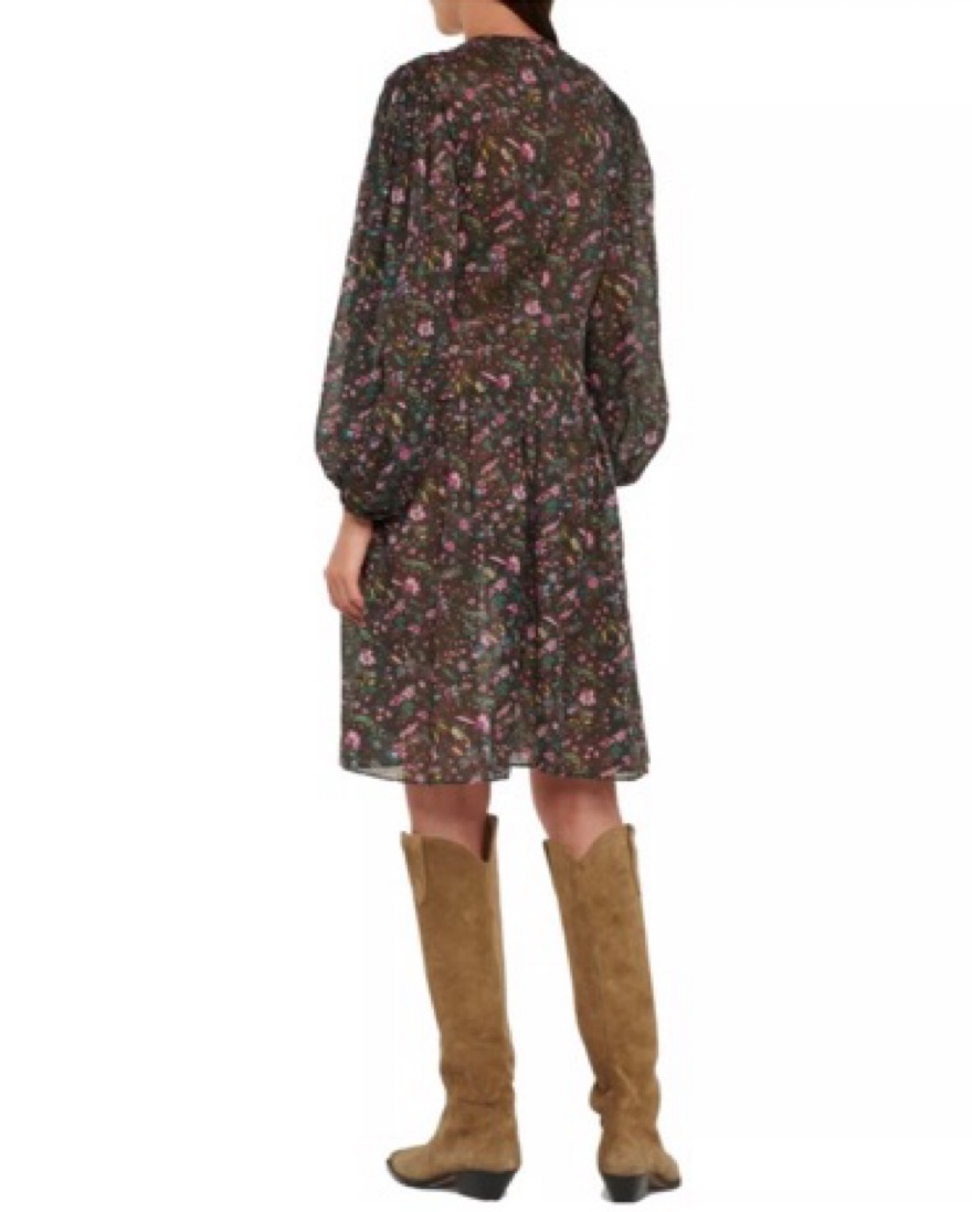 Size EU 40 which is similar to a US size 8 or Large. This stunning knee length dress features a dreamy floral print in a palette of moody hues. The floaty, puff-sleeved silhouette creates an effortlessly elegant look perfect for a special occasion or date night. Button at neck. V-neck. Unlined