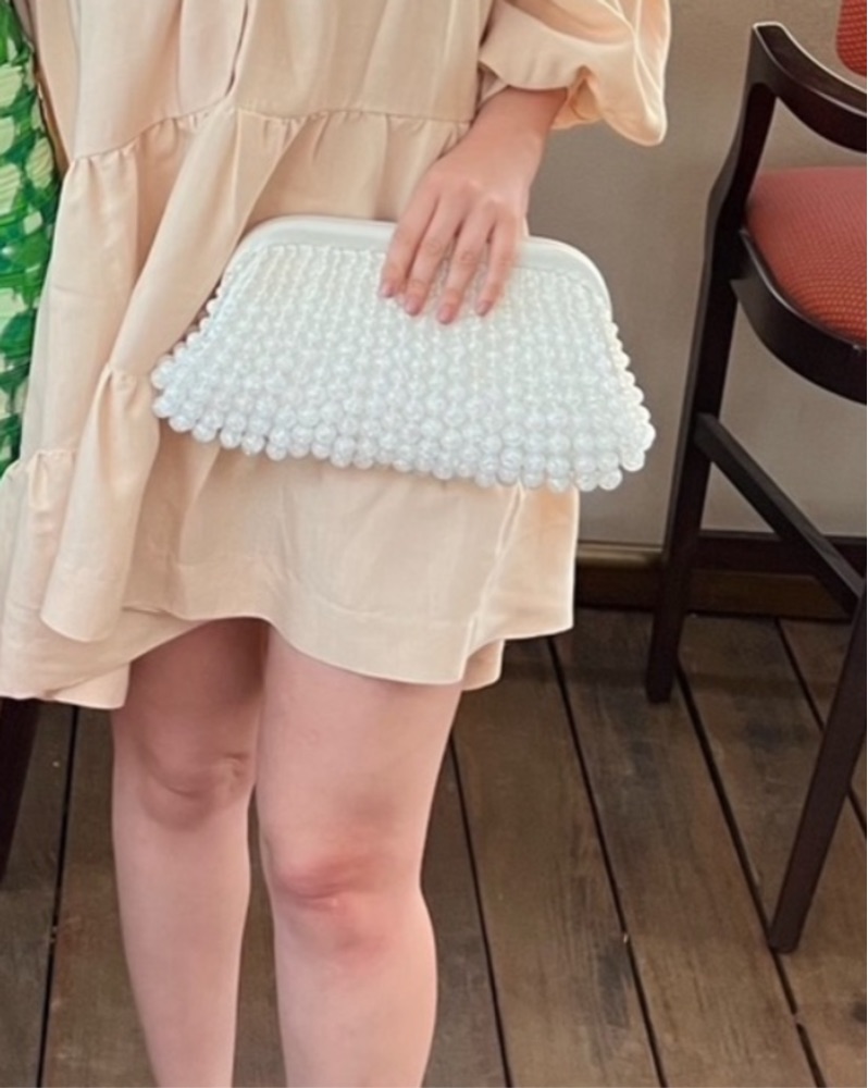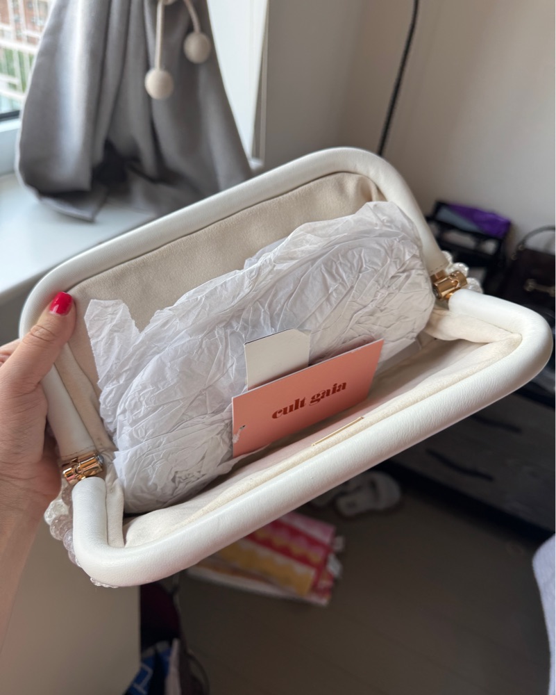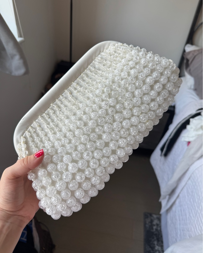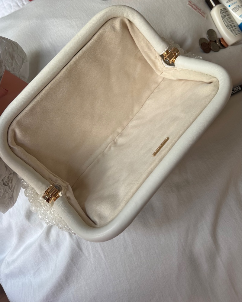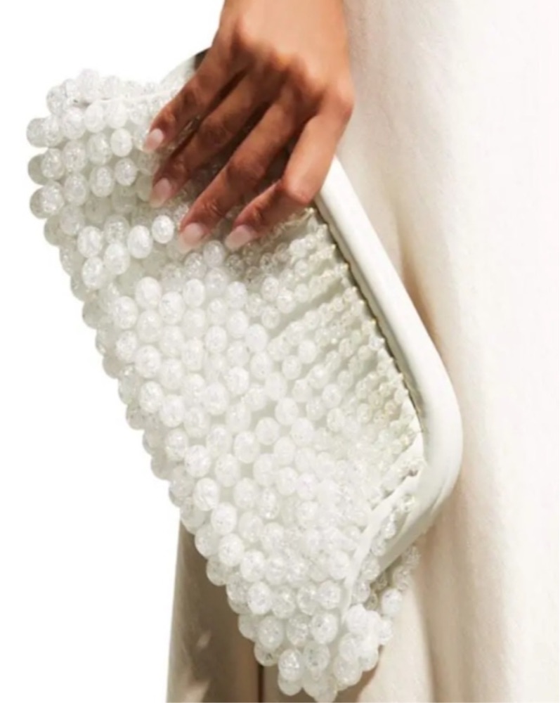 The Cult Gaia Nia Clutch is crafted from acrylic beads and features a framed top with a hinge closure. The clutch measures 6"H x 12.5"W x 1"D. It is a beautiful and elegant accessory for any occasion. White colored Top Style: Framed Material Acrylic Beads And Leat