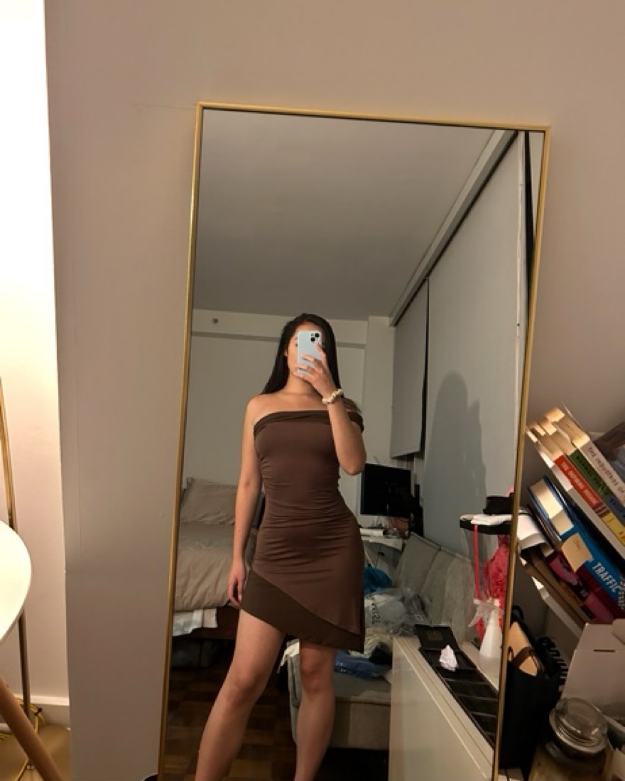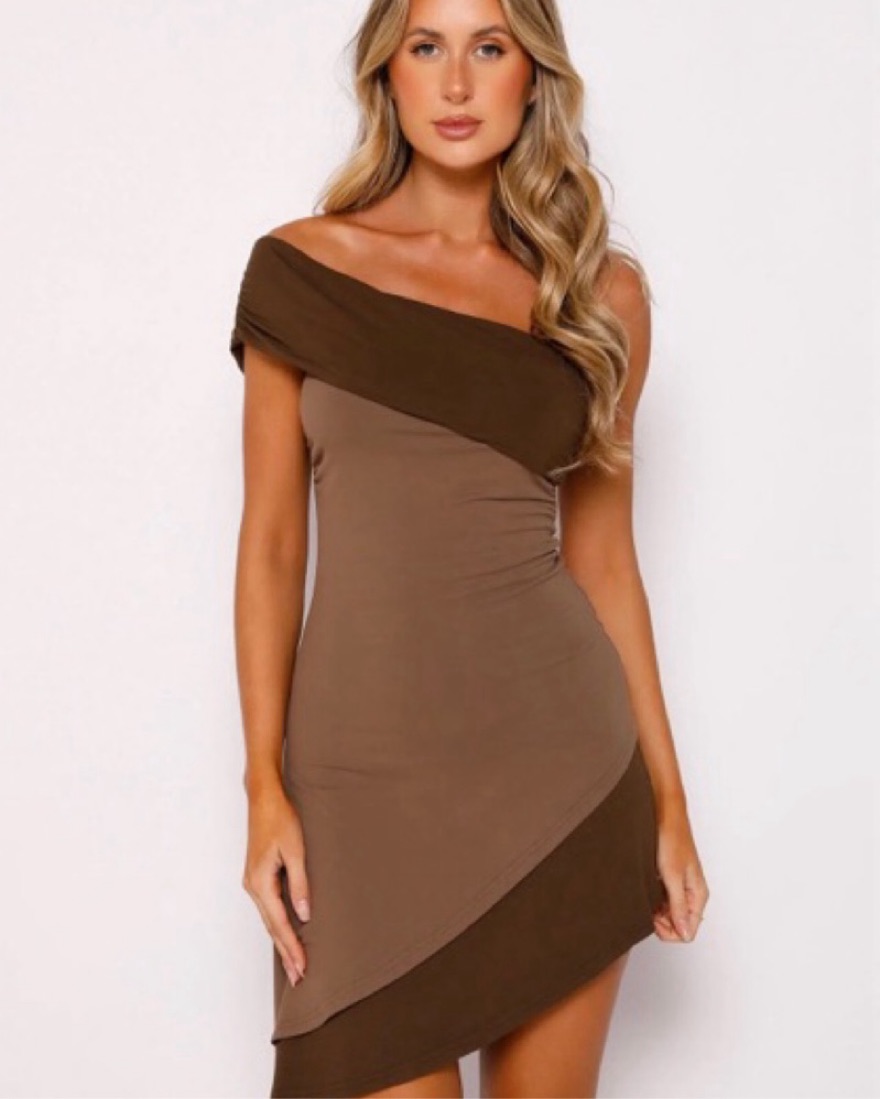 Two toned brown asymmetrical mini dress from Tiger Mist, gorgeous dressed up or down.
