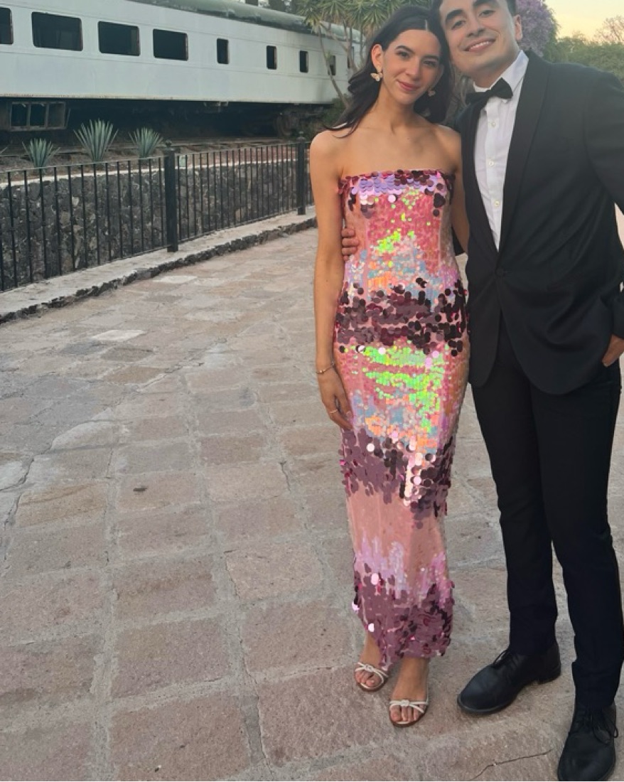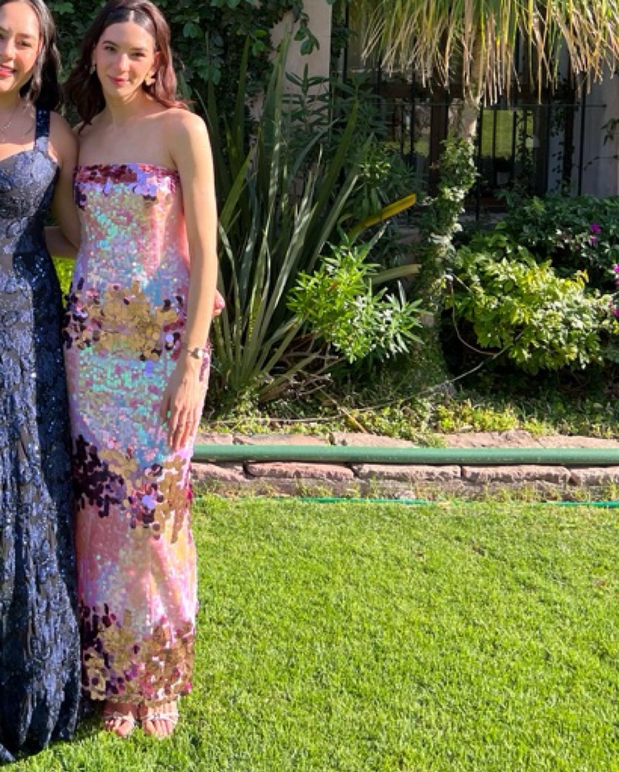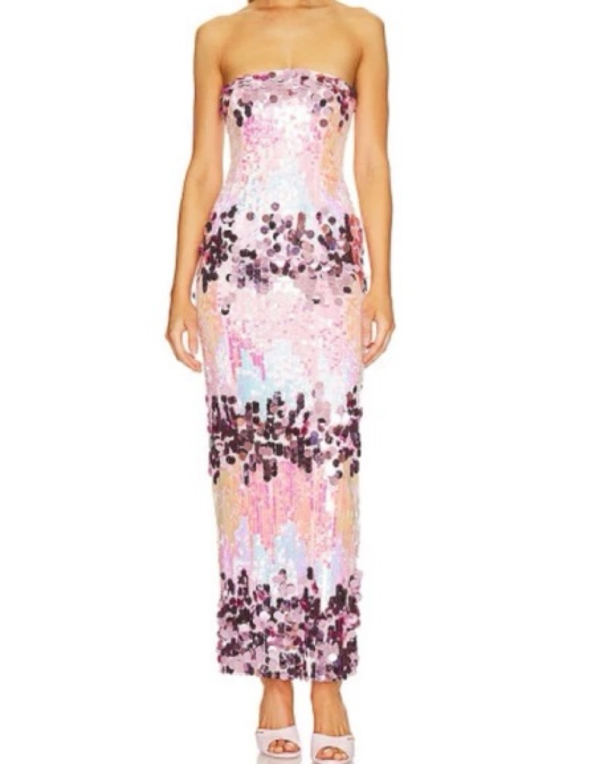 Resized from size 4** The MAJORELLE Yasmina Gown in Iridescent Pink Multi is a dazzling choice for feminine formal wear. Its bustier bodice flatters the figure, while multiple sizes of sequins create a stunning play of light.