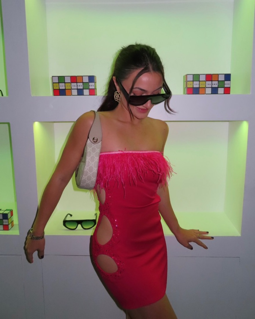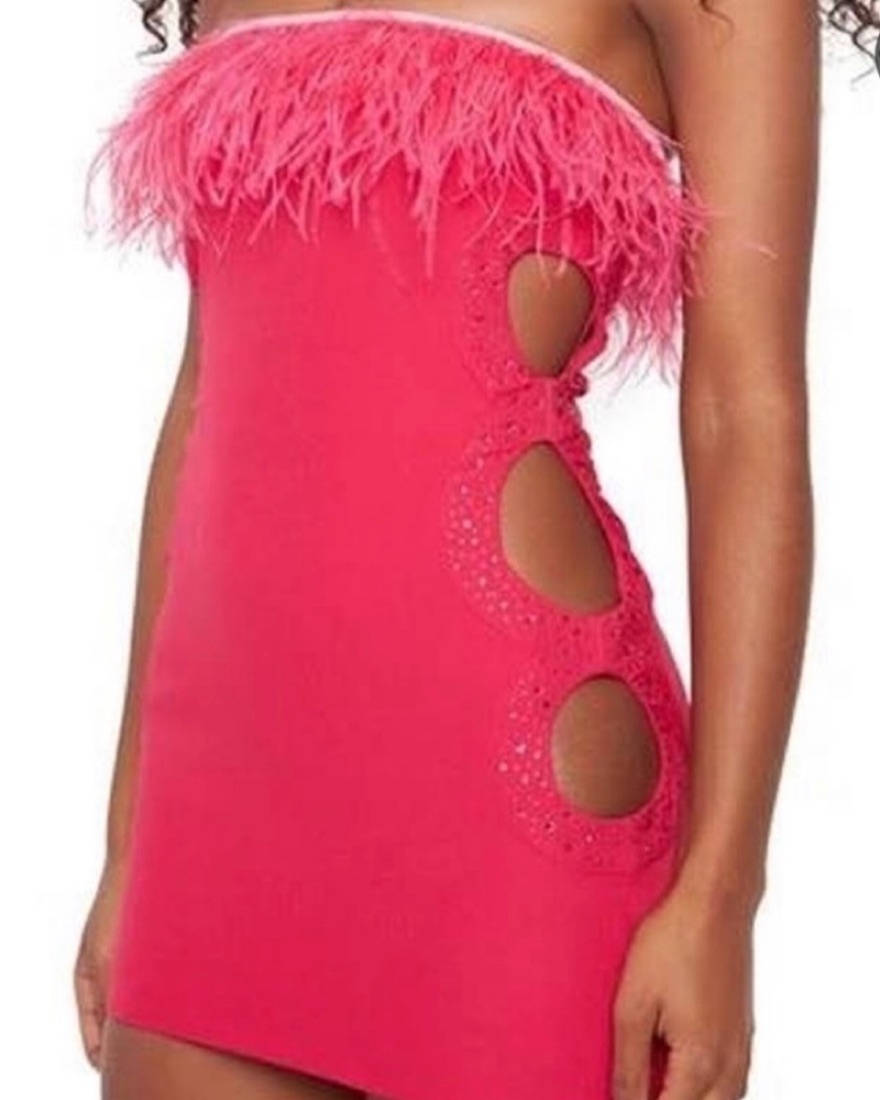 Guizio Feather Trim Embellished Cut Out Dress in Rouge Pink. Features strapless neckline with feather trim, cut out side detail, crystal embellishments, short mini length, tight bodycon silhouette.