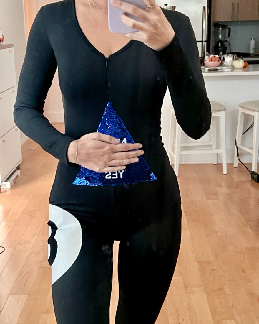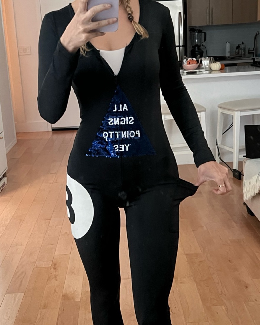 The sequins change the words from “Not likely” and “All signs point to yes.” Very flattering jumpsuit with quarter zip and side pocket!!