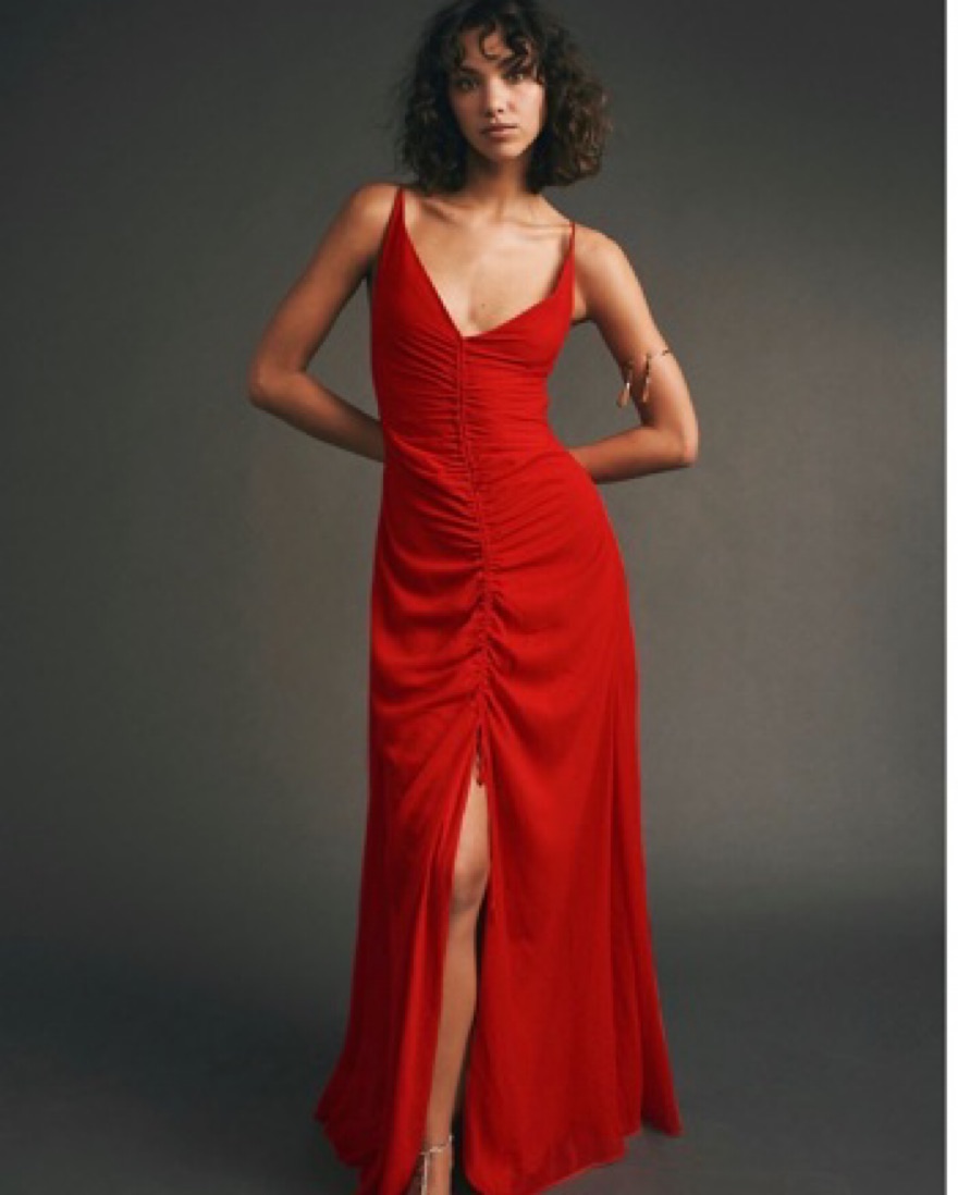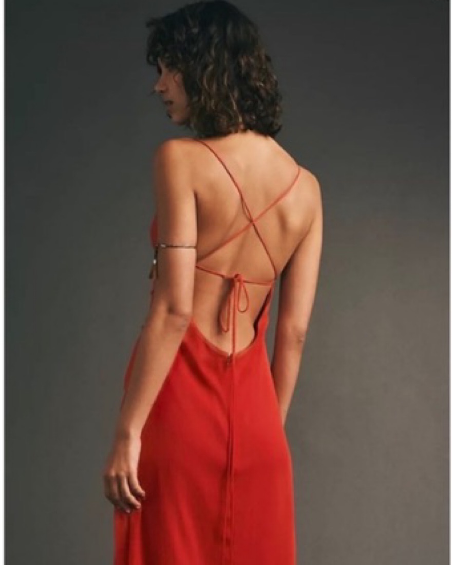 Red maxi length Free People dress with strappy back detailing. The ruching in the front can be adjusted to make the slit longer or shorter.