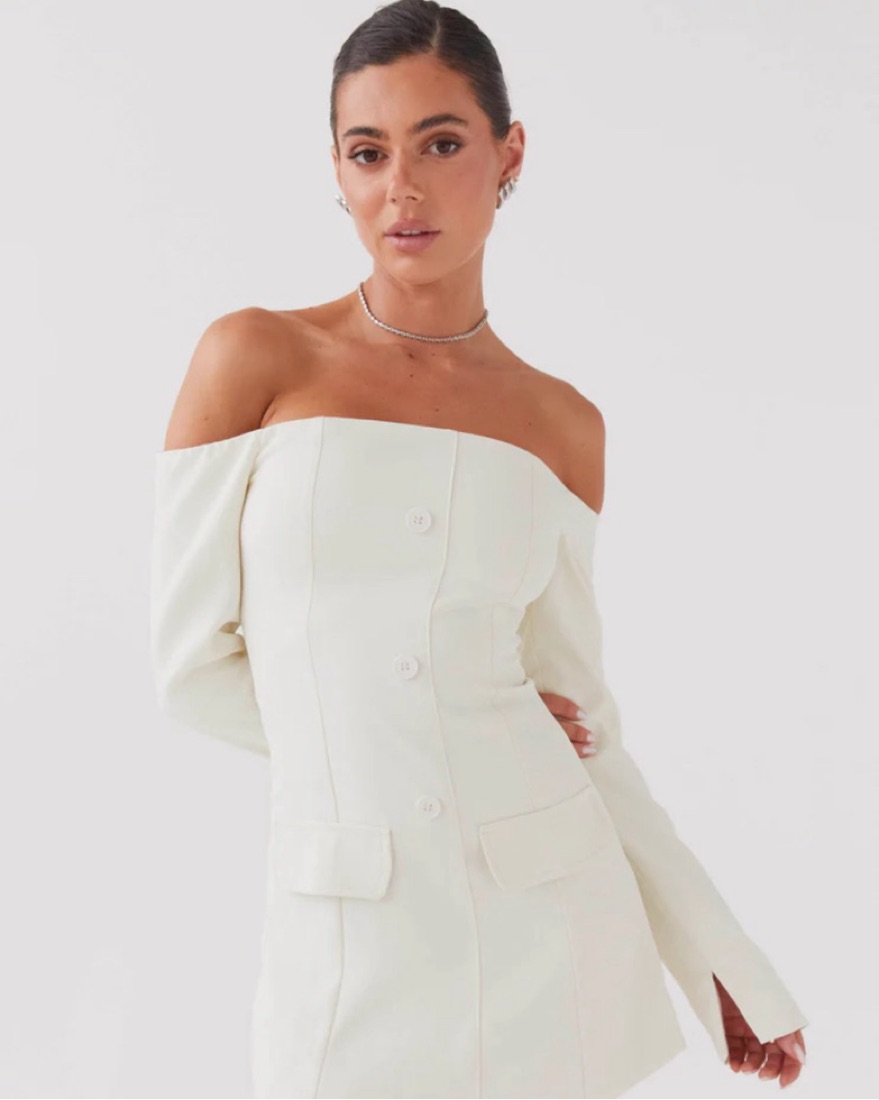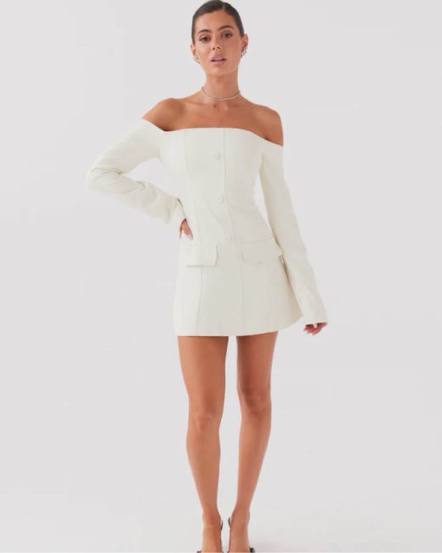This versatile white blazer dress is perfect for special occasions. The off-the-shoulder design and tailored silhouette create a sophisticated, elevated look.
