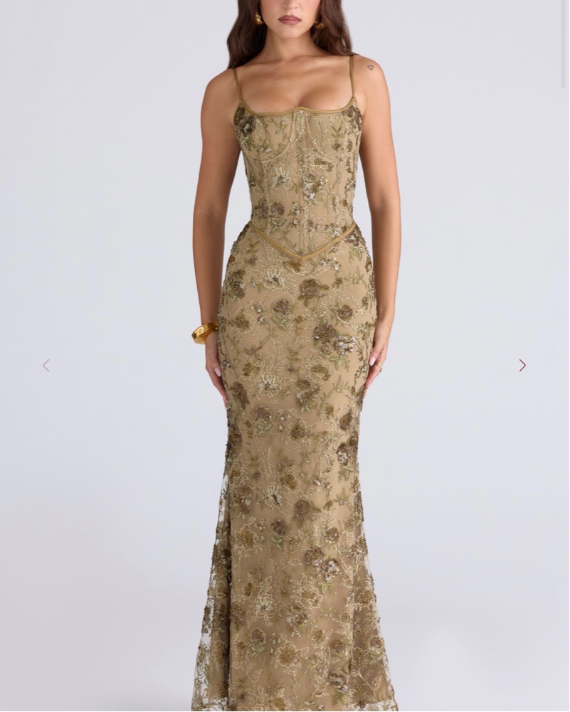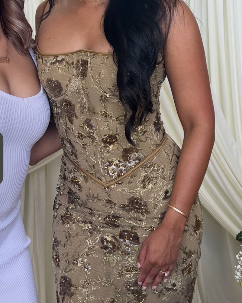 olive green / bronze naima dress! size small - not altered ! im typically a size small but my hip meausment (40in) fits veryyy snug so just beware!