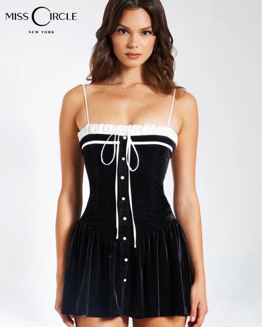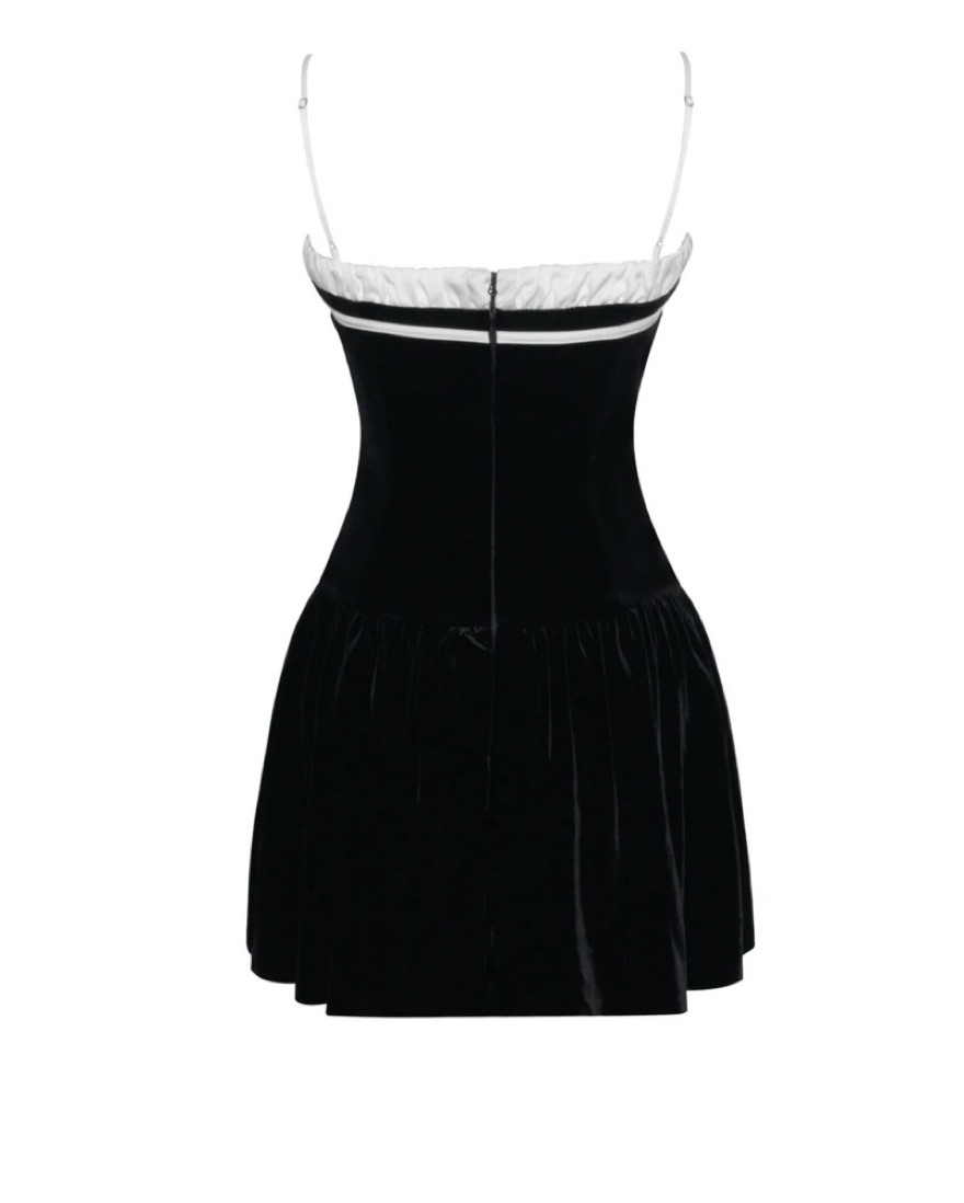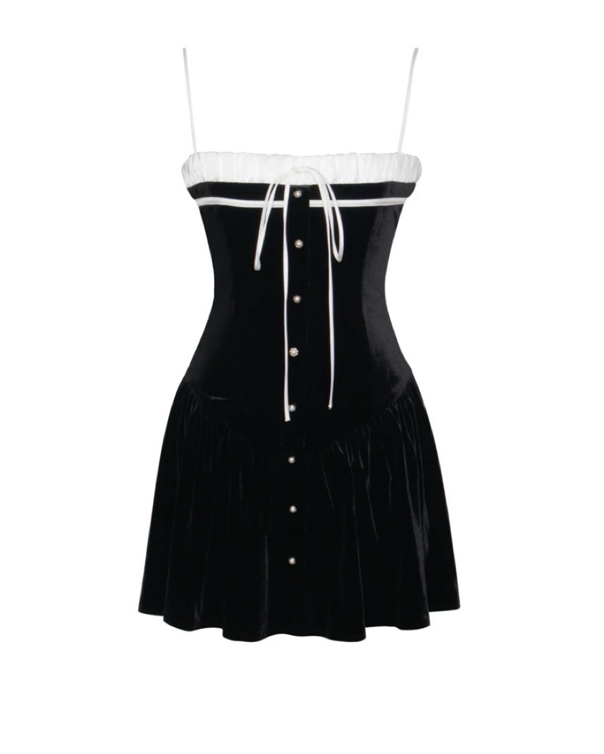 Features a satin ribbon tie and gold pearl shank buttons down the center front. With a built-in corset for a snatched silhouette, the design showcases a drop "V" shaped waistline. Crafted from luxe stretch velvet with double duchess satin details, this dress is fully lined for comfort.
