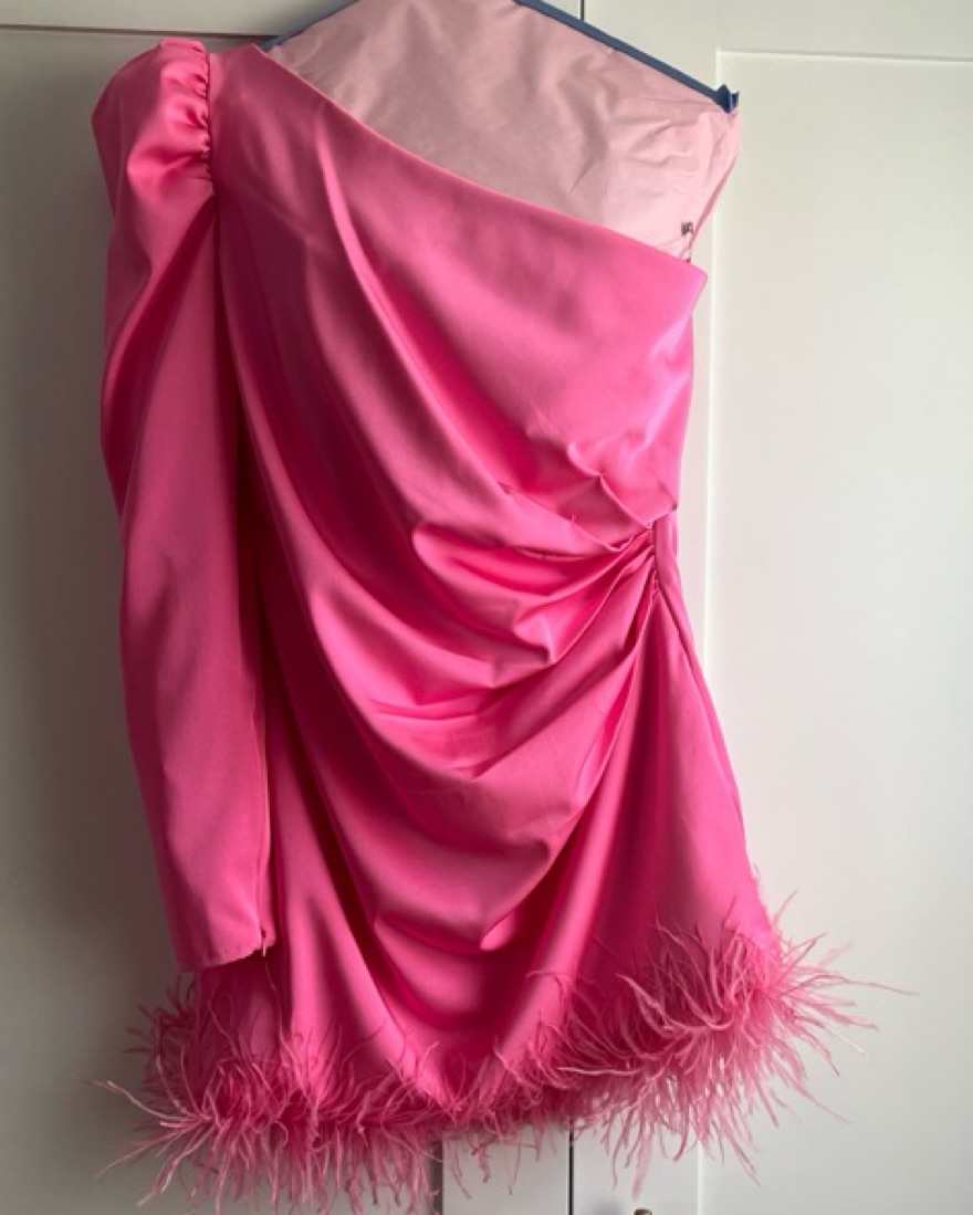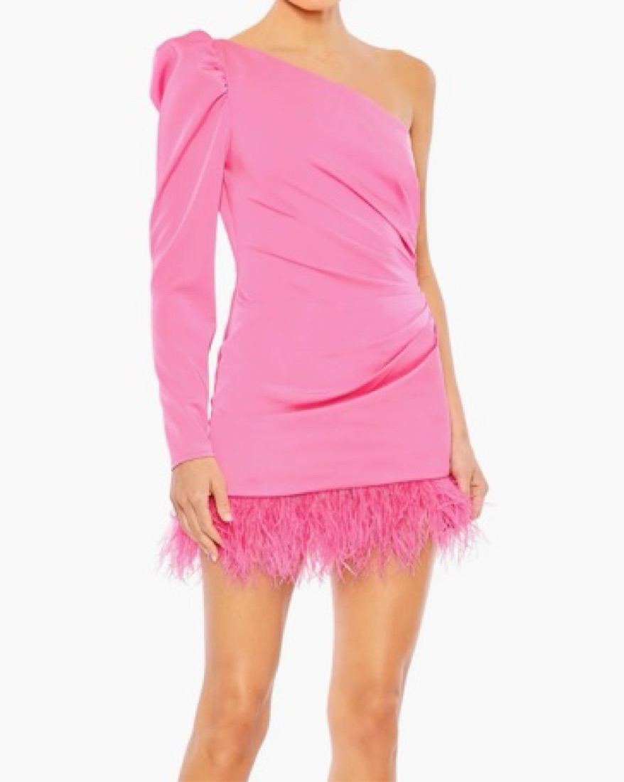 One shoulder hot pink minidress with rouching and feather trimmed on the bottom.